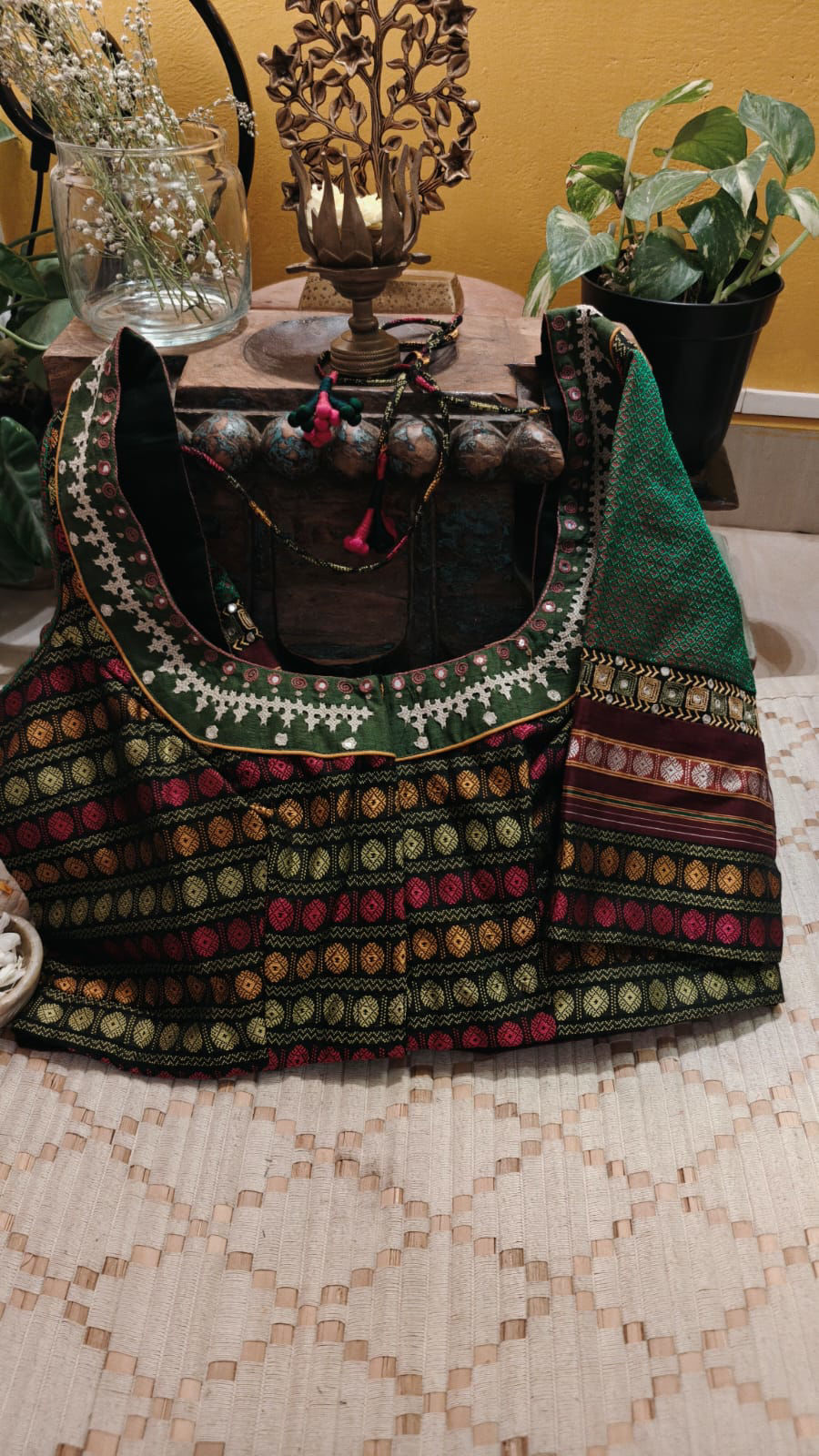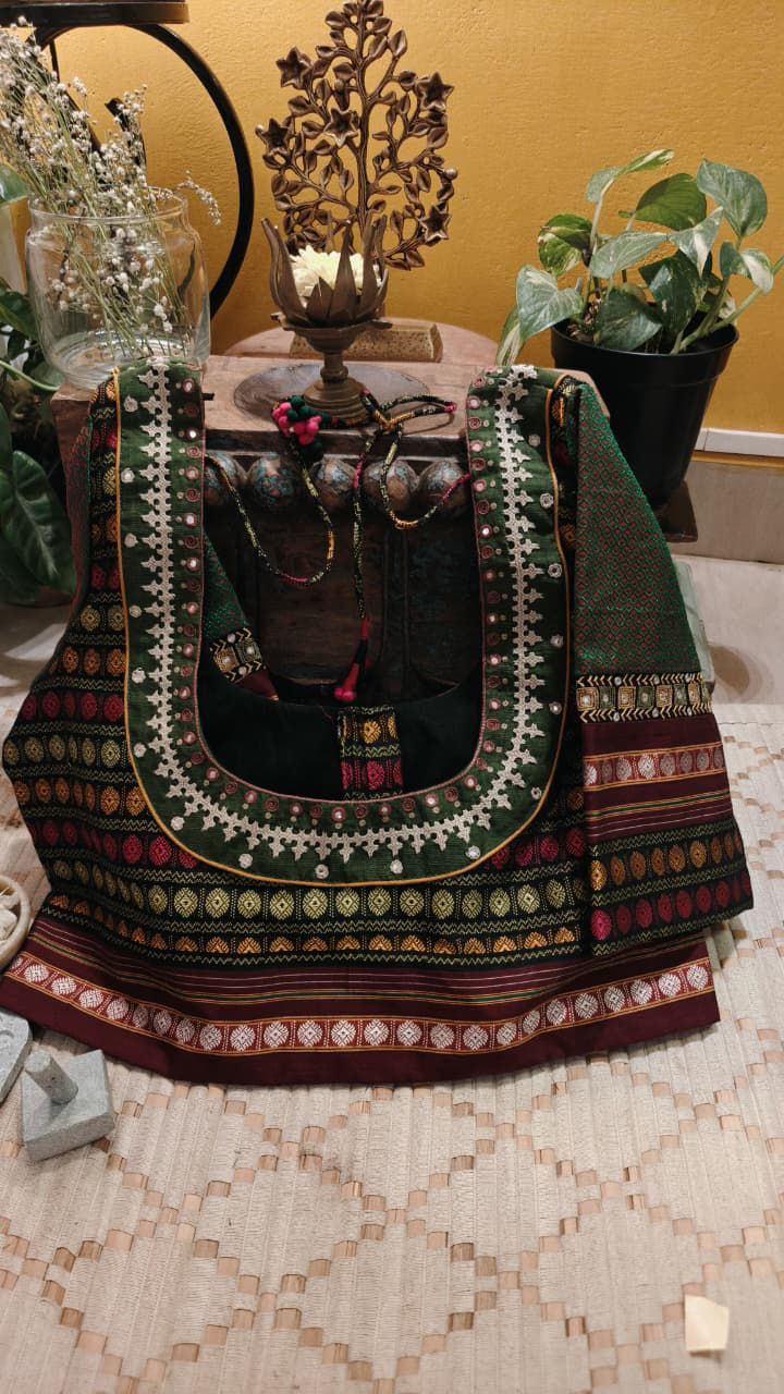 Crafted in timeless Kanchi cotton, this piece is framed with bold tribal borders that lend strength and character to its simplicity. The richness of the weave meets the raw beauty of indigenous motifs, creating a balance