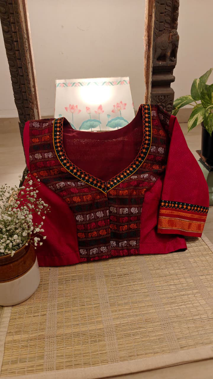 Our artisans creatively hand embroider, hand paint and hand print the blouses that come to you from the design house of SVASA. We use hand woven fabric extensively. You may notice very minute, almost insignificant flaws in the crafts since they are all handmade. We urge our patrons to overlook a few human errors that may have occurred in the process. Our aspirations are towards an empowered society, focusing on keeping traditional needlecraft alive for a long time to come.