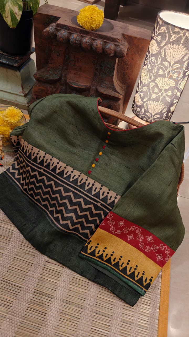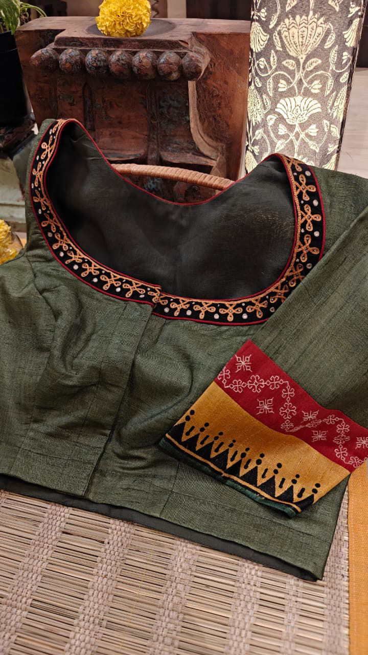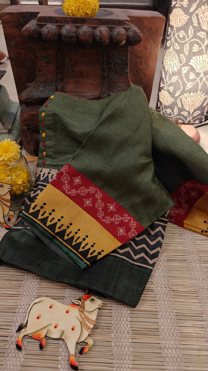 Forest green pure tussar silk, brought alive with chevron prints, intricate Kasuti embroidery, and finished with classic Kolam borders. A rich blend of tradition and geometry — bold, rooted, and crafted to stand out quietly. Handmade with love. Svasa exclusive.