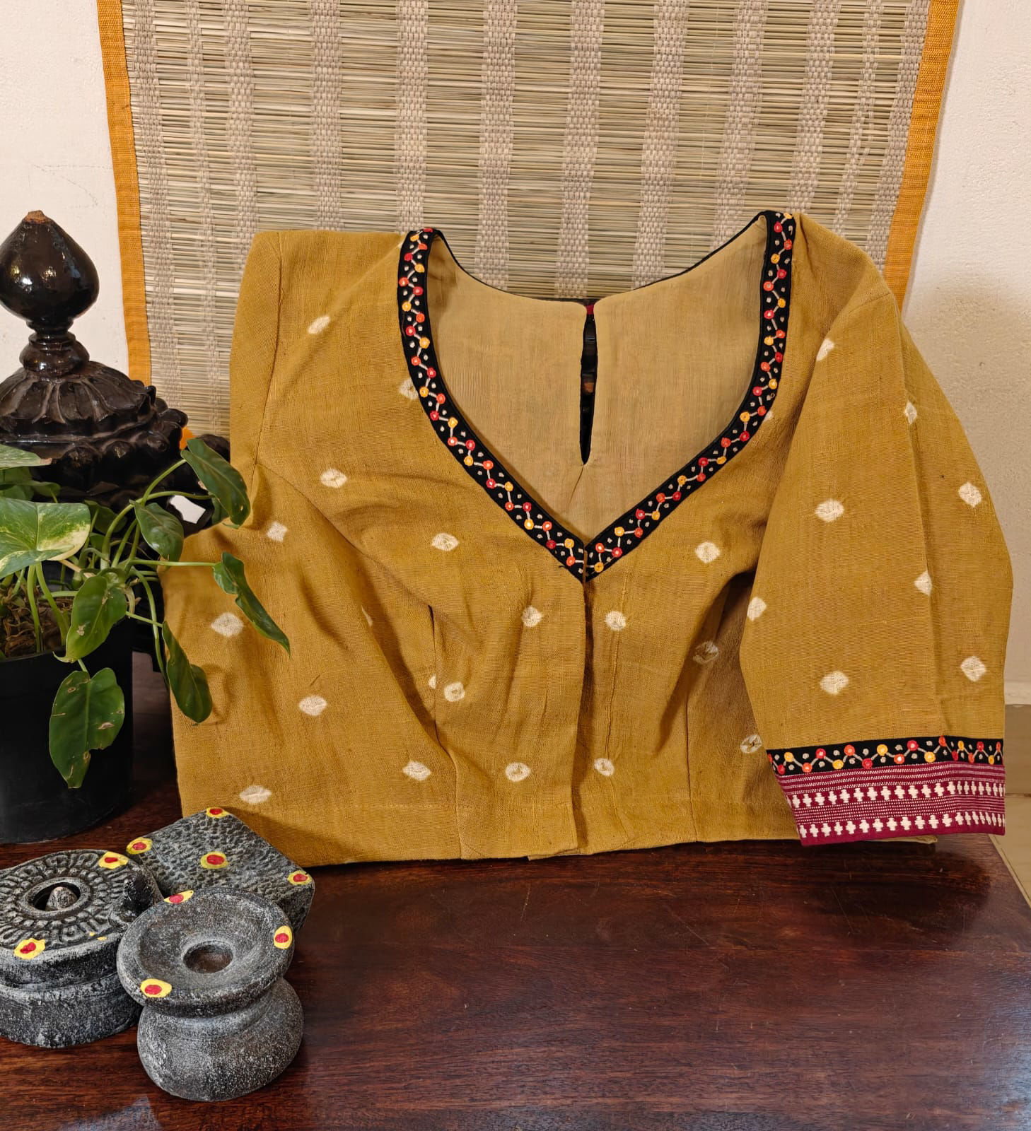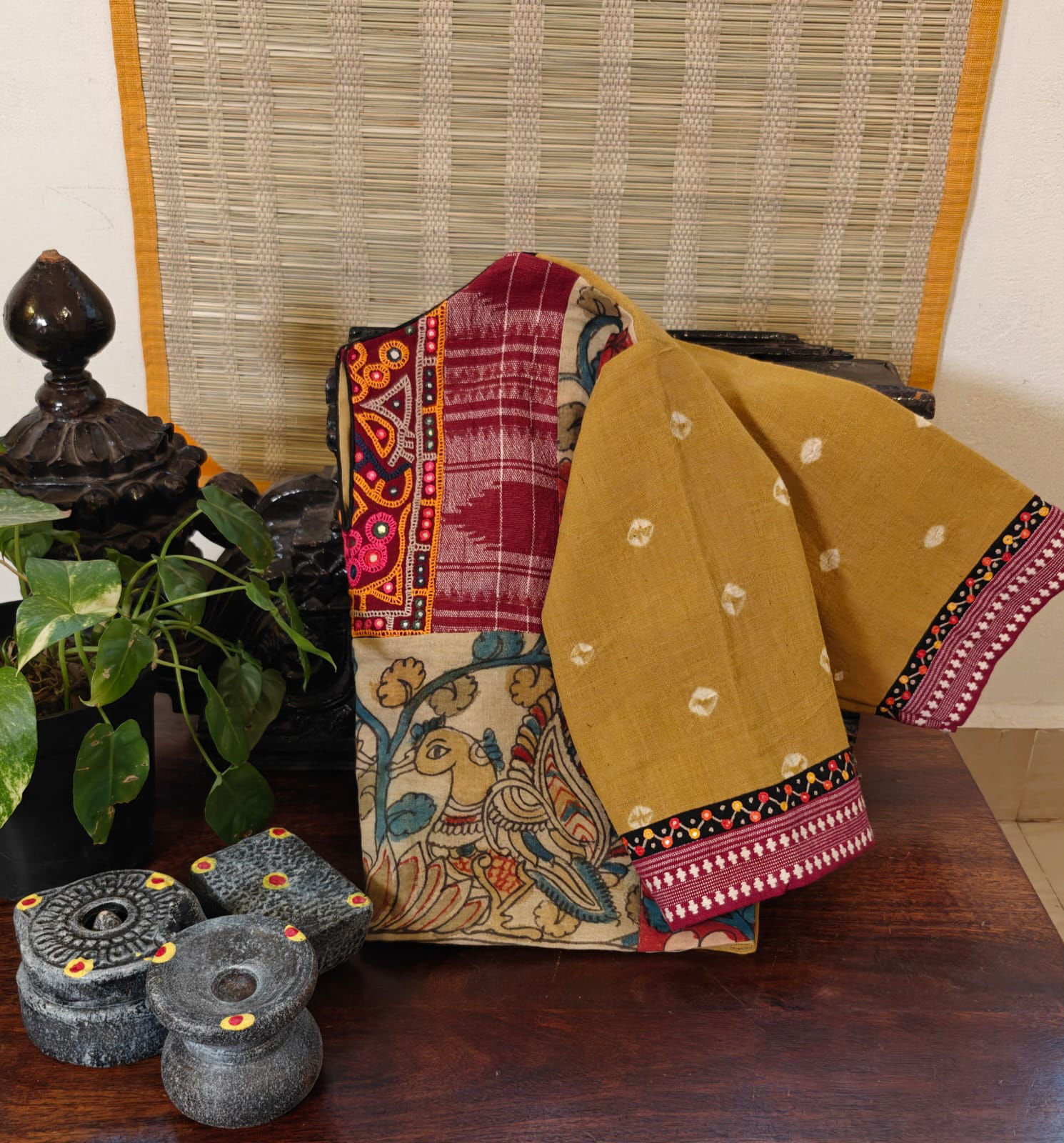 Kalamkari fused with rustic Kotpad and bursts of colourful embroidery — a story stitched by many hands. Paired with a hand-knotted Sungudi in Fenugreek tones, this piece carries the soul of natural craft. Sustainable. Thoughtful. Beautifully handmade.