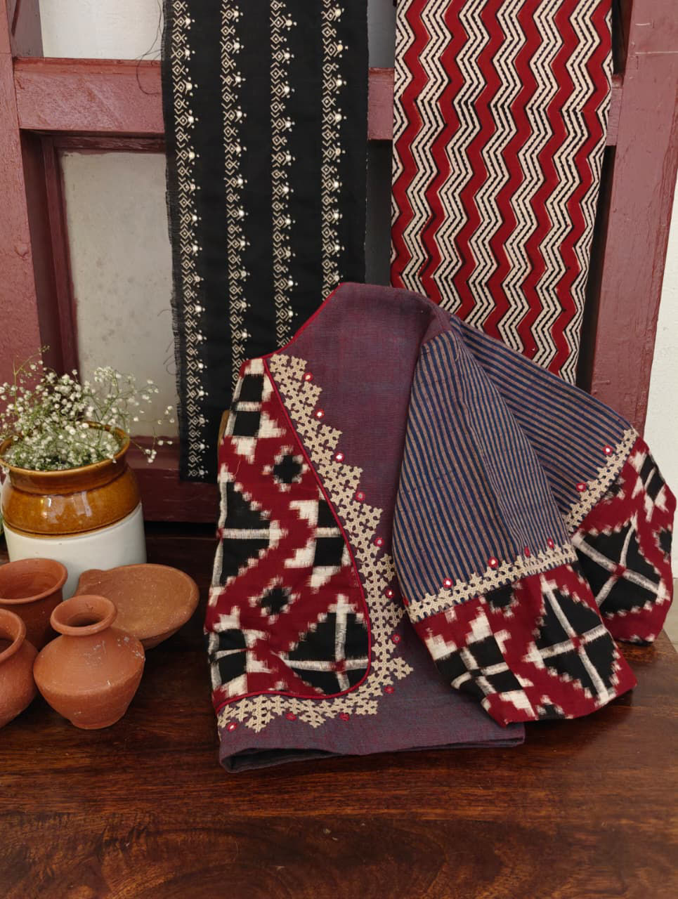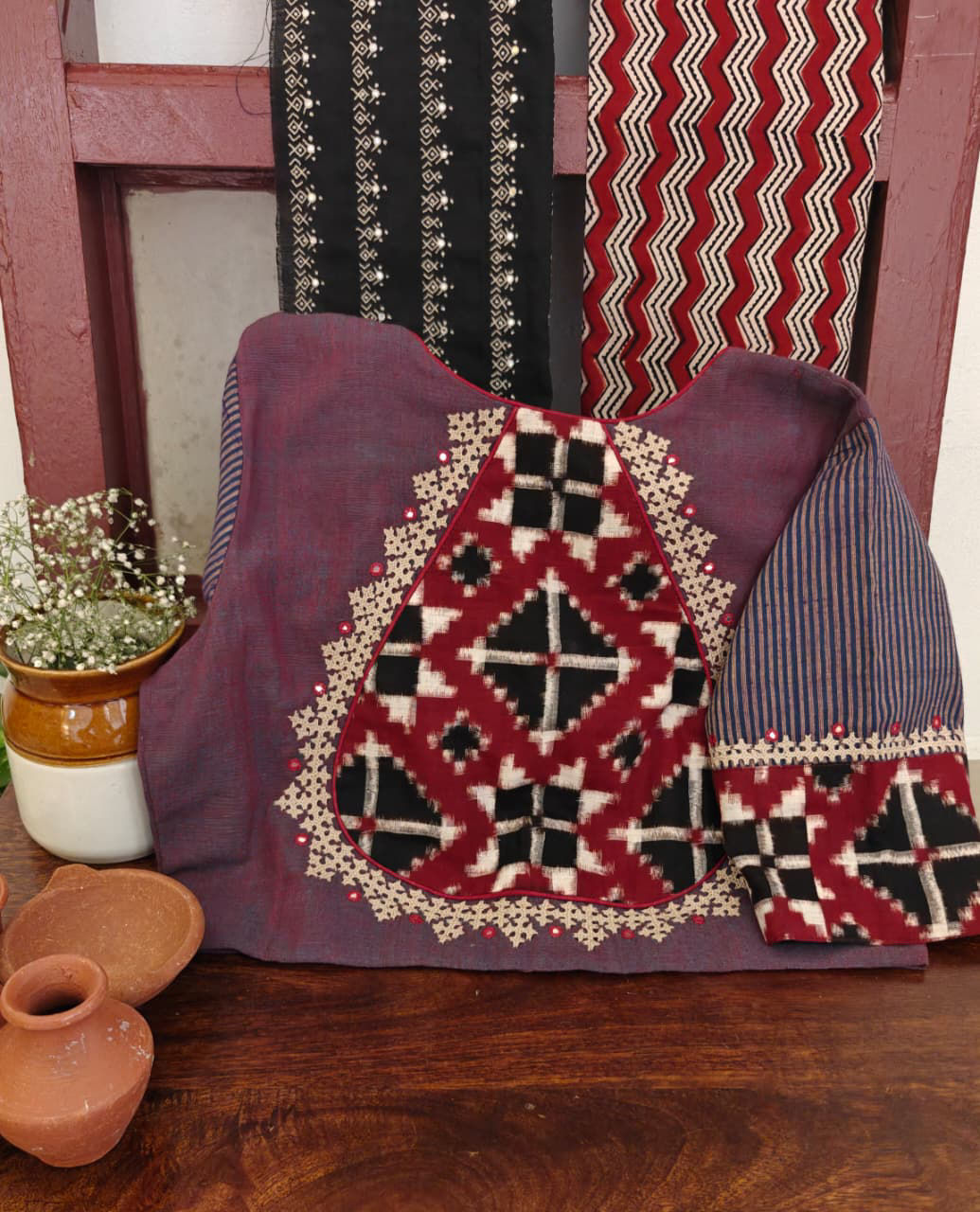 A striking mix of Kotpad and Telia in a deep purple paired with maroon and black, finished with ivory Telia details. Thick Kutchi embroidery around the yoke in ivory brings a bold handcrafted character to this pure cotton creation — rooted, rustic, and unmistakably Svasa.
