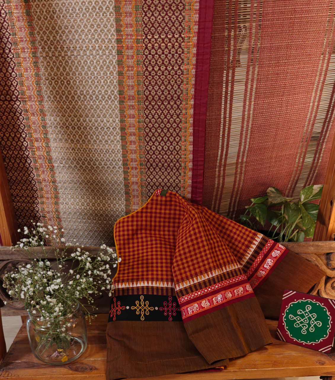 Kandangi checks in pure cotton, paired with delicate kolam motifs — a quiet tribute to temple courtyards and early-morning alpanas. Handcrafted in tradition, held together by the rhythm of Margazhi.