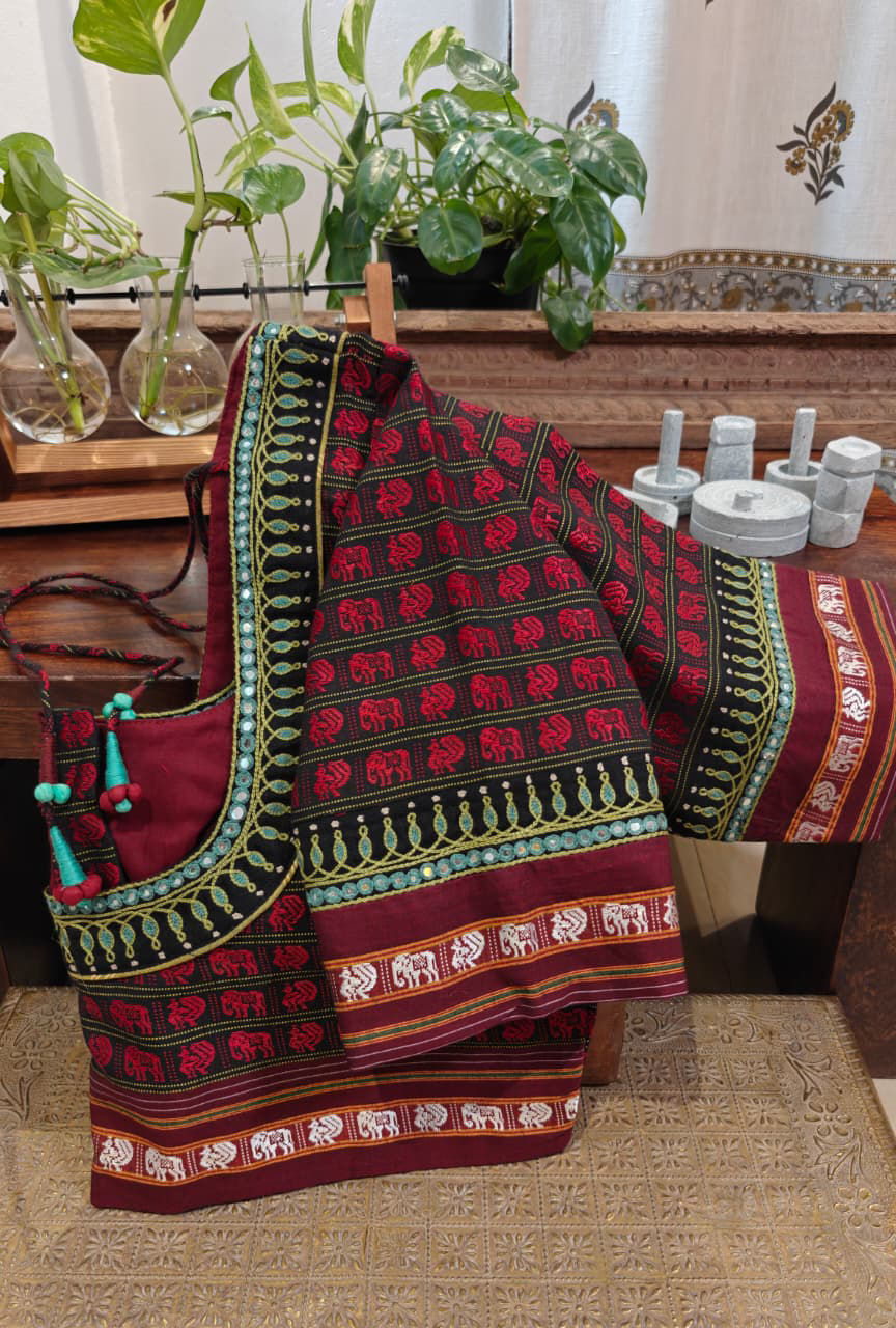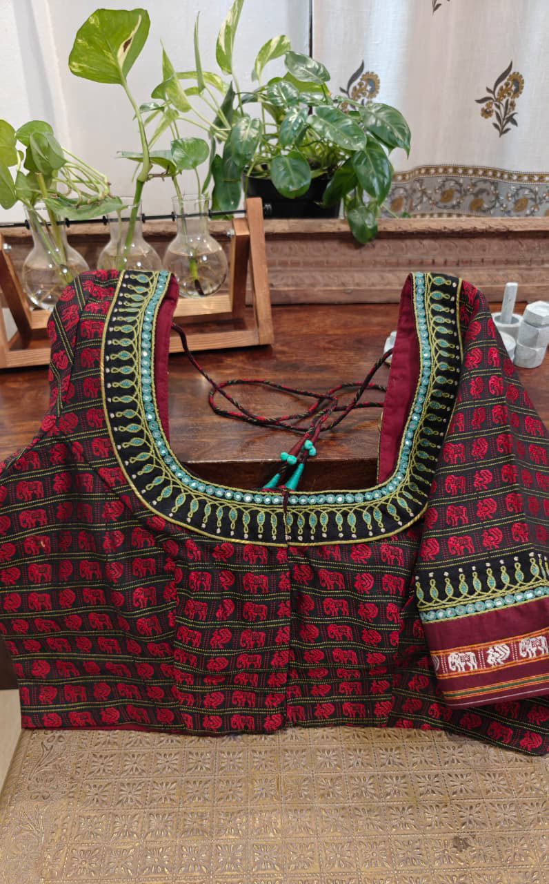 A rich maroon Khun cotton blouse, embroidered in sea green and olive threads. A blend of bold and earthy—crafted to stand out while staying rooted in tradition.