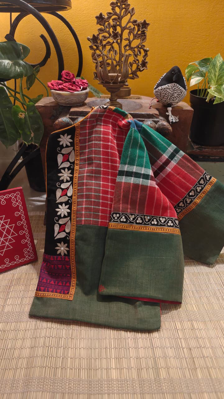 A vibrant play of multicolour checks brought together with classic Mughal borders, this Svasa exclusive carries old-world richness with a fresh, striking spirit. Detailed, distinctive, and thoughtfully handcrafted, it is a piece that stands out with quiet confidence and timeless charm.