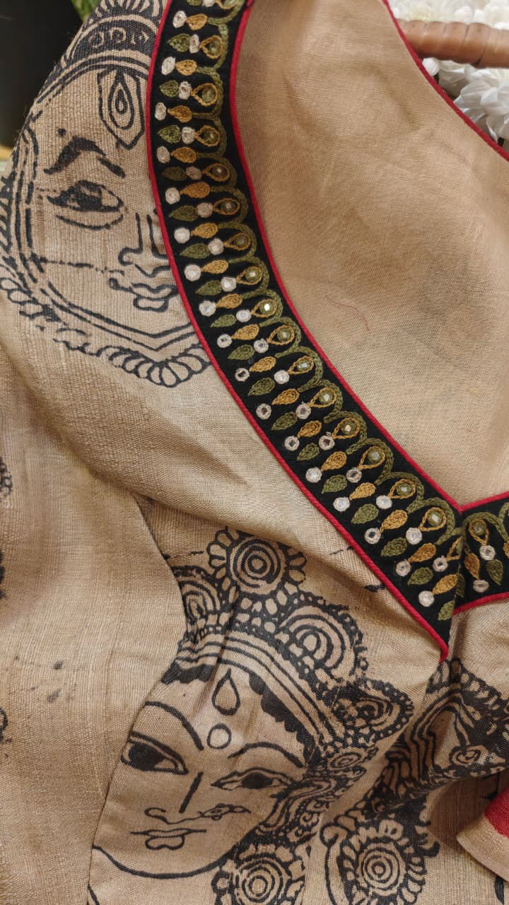 Murals unfold in kalamkari on raw tussar silk, hand-blocked in black and jade green. Embroidery in earthy olive and ochre traces the surface like stories on ancient walls β€” layered, deliberate, and deeply rooted. A meeting of art and textile, crafted slowly in true Svasa spirit.