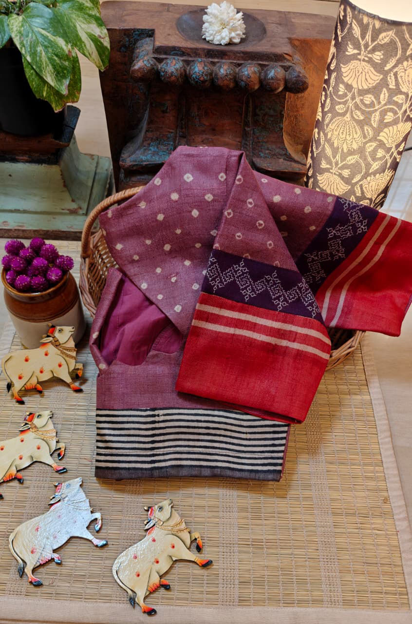A soft dull pink tussar silk, gently offset with purple tones and detailed with intricate Kasuti embroidery. The play of subtle hues and fine handwork brings depth to the weave—quiet, refined, and deeply rooted in craft.