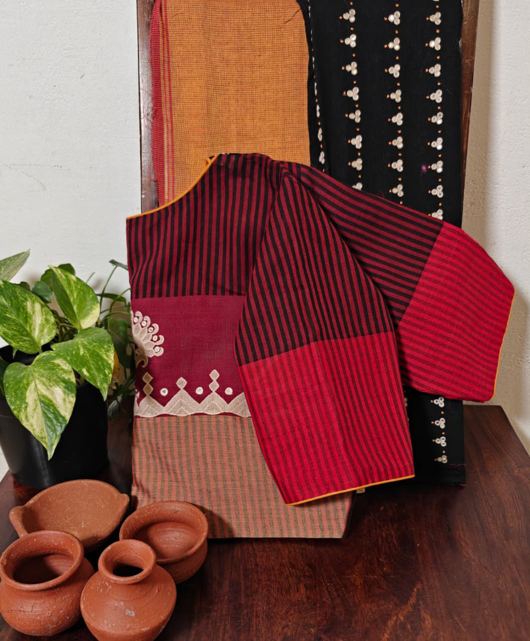 Narayanpet stripes in earthy tones, elevated with tribal borders embroidered in ivory. A beautiful blend of tradition and raw artistry β€” understated, handcrafted, and distinctly Svasa.