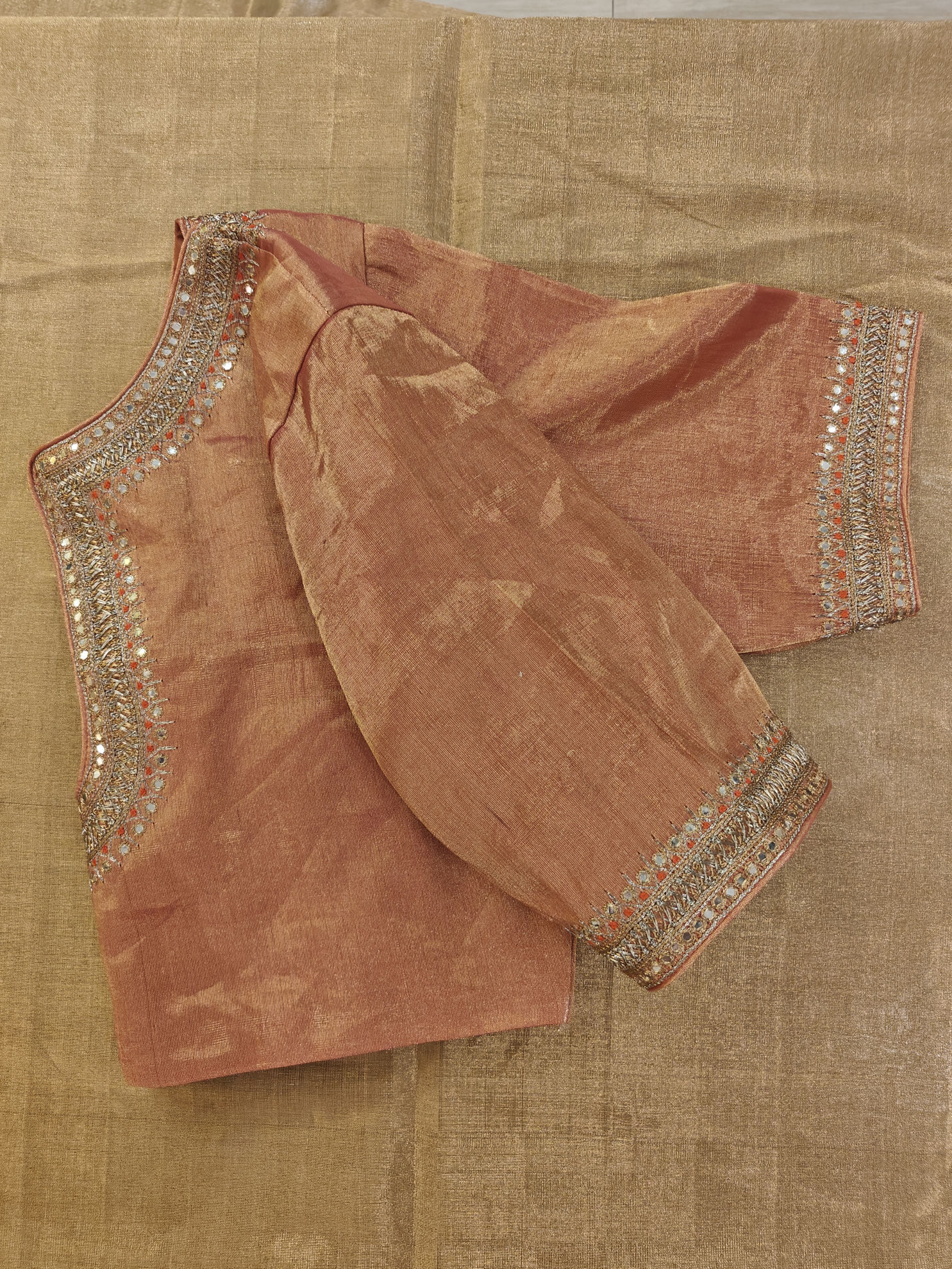 Step into old-world charm with this antique tissue blouse in coral featuring intricate gold embroidery and dots of orange thread work . ✨ Fit for special occasions and classy weddings. Elevate your style and make a statement with this timeless and elegant piece.