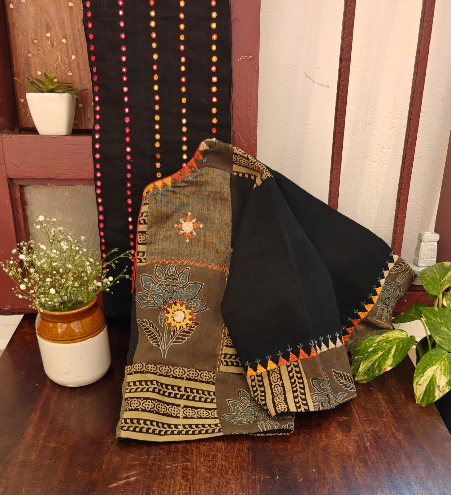Olive, sage, and charcoal come together—stitched as one. Reclaimed fabrics, thoughtfully sewn, carry abstract embroidery that celebrates imperfection and intent. A sustainable piece where every seam tells a story of reuse, restraint, and quiet craftsmanship.