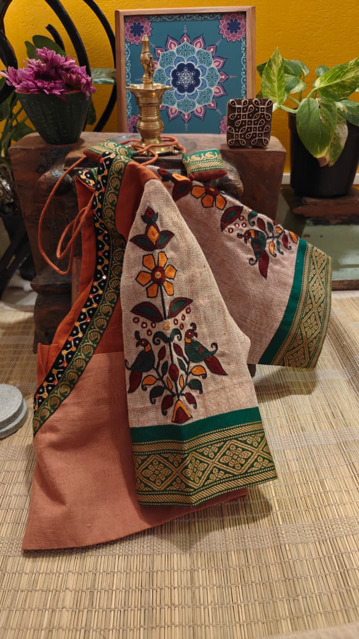 Our artisans creatively hand embroider, hand paint and hand print the blouses that come to you from the design house of SVASA. We use hand woven fabric extensively. You may notice very minute, almost insignificant flaws in the crafts since they are all handmade. We urge our patrons to overlook a few human errors that may have occurred in the process. Our aspirations are towards an empowered society, focusing on keeping traditional needlecraft alive for a long time to come.