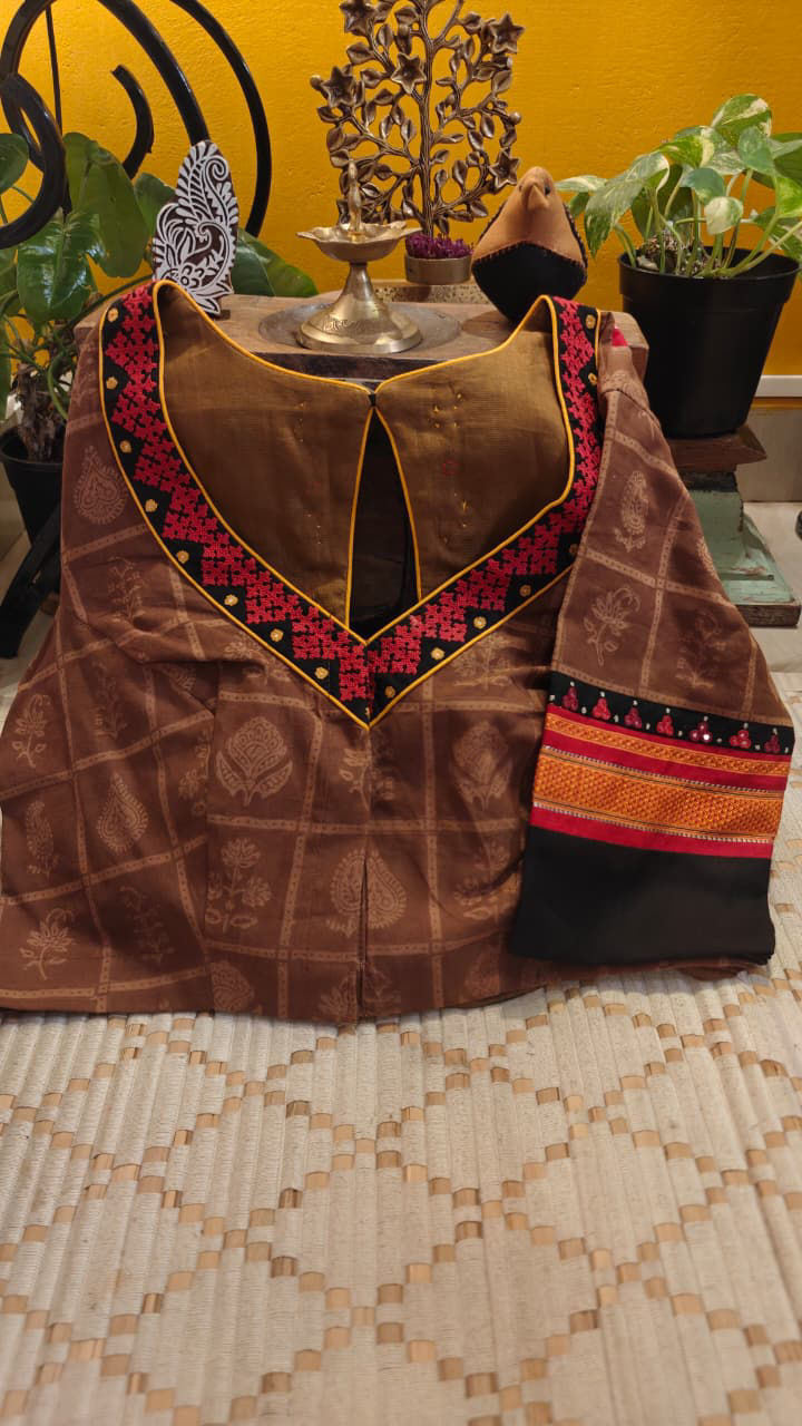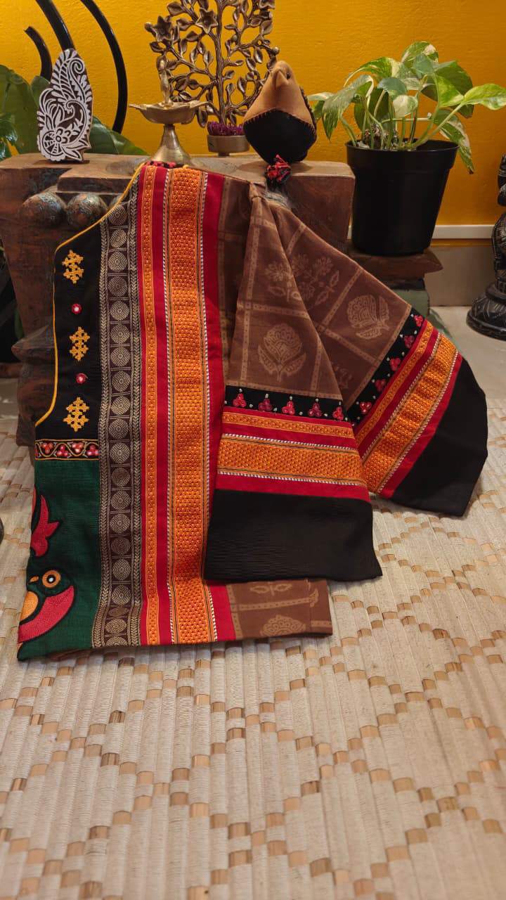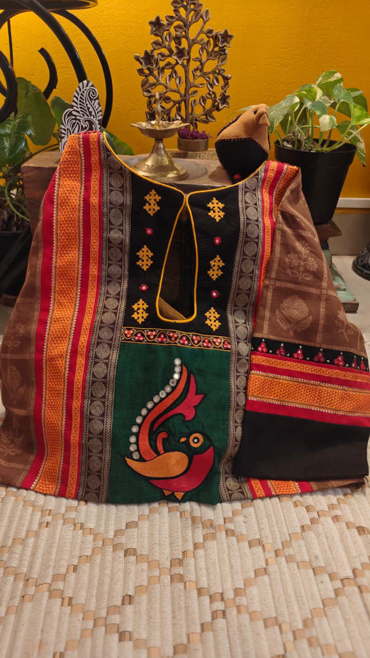 Our artisans creatively hand embroider, hand paint and hand print the blouses that come to you from the design house of SVASA. We use hand woven fabric extensively. You may notice very minute, almost insignificant flaws in the crafts since they are all handmade. We urge our patrons to overlook a few human errors that may have occurred in the process. Our aspirations are towards an empowered society, focusing on keeping traditional needlecraft alive for a long time to come.