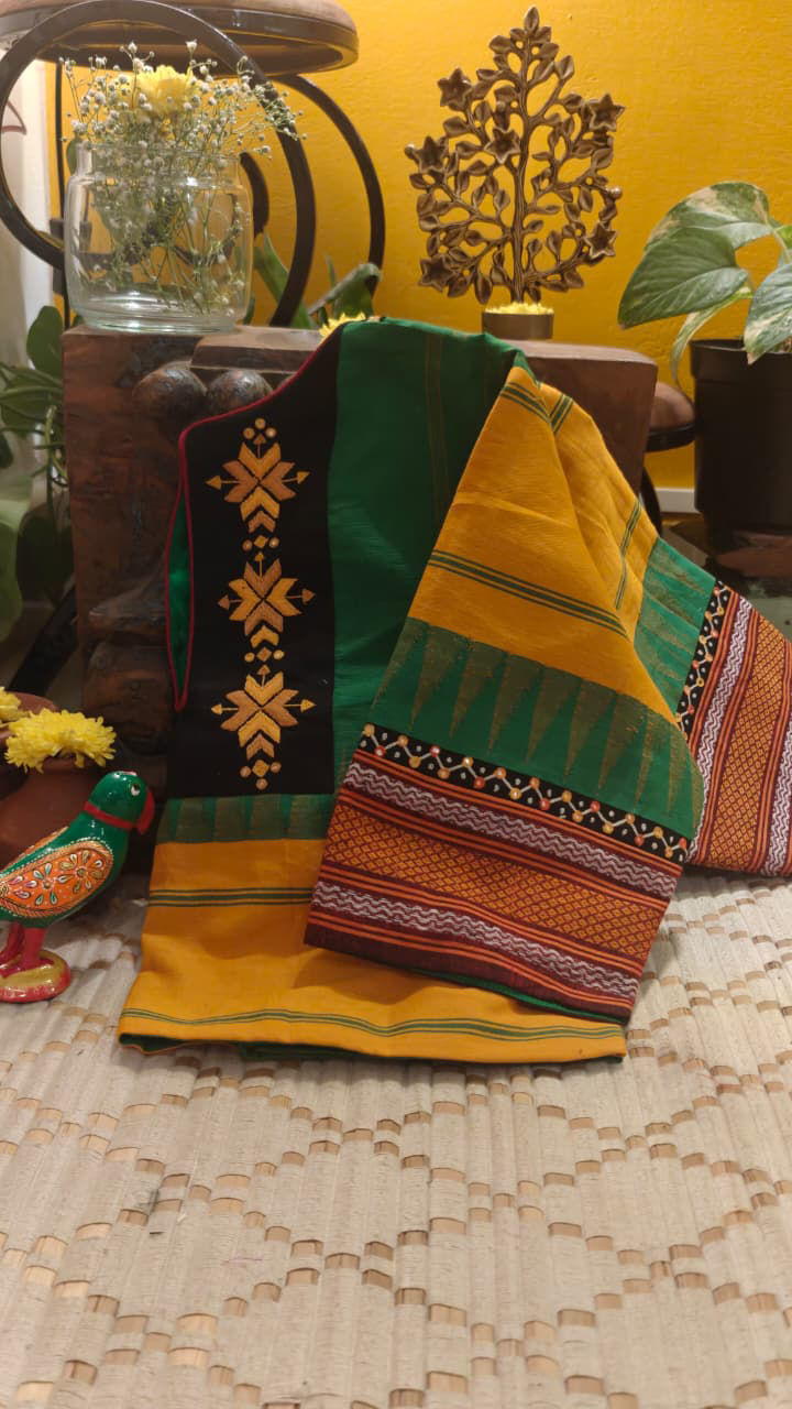 A vibrant parrot green Kanchi cotton, alive with energy and tradition. The turmeric yellow border frames it beautifully — bold, festive, and unmistakably rooted. Charcoal and turmeric embroidery trace intricate motifs across the fabric, creating striking contrast against the green base. The addition of colourful mirror borders brings a playful glint — tiny reflections that catch the light and add movement to every step.