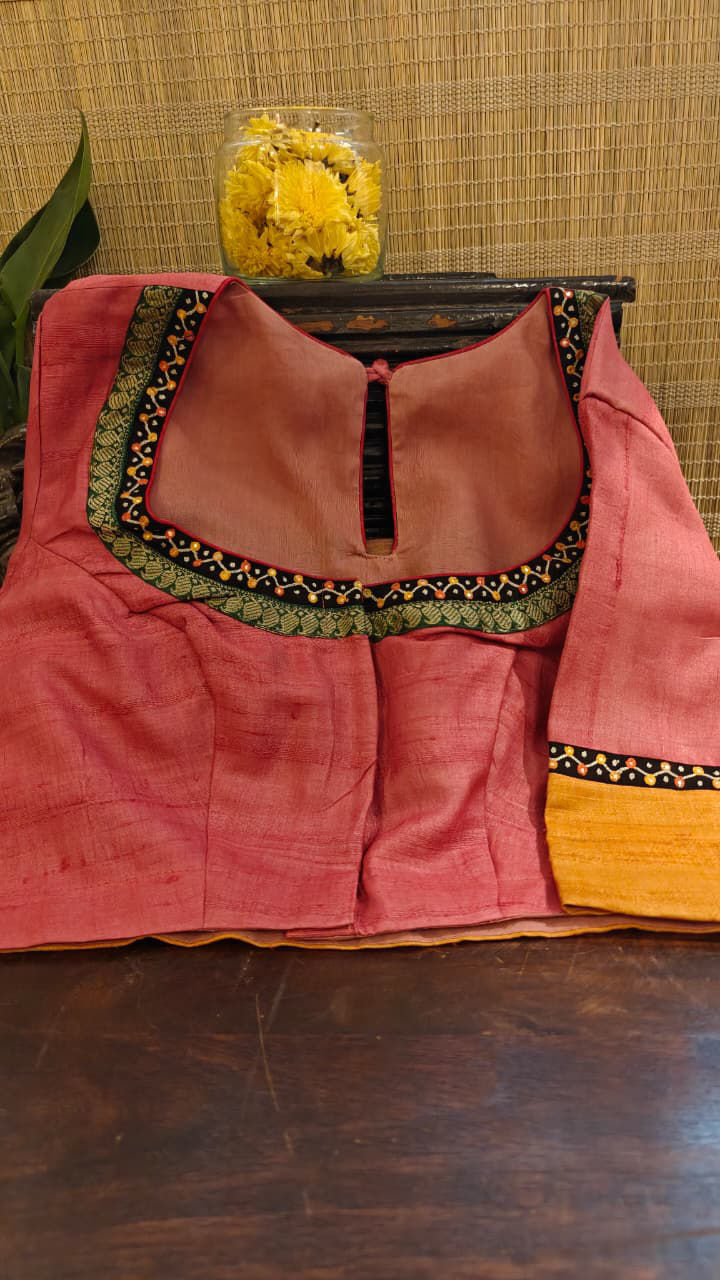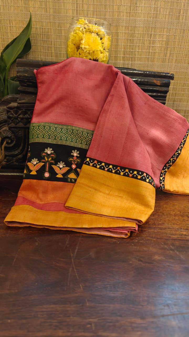A radiant tussar in hues of peach, orange, and yellow—warm, sunlit tones that come together in a beautiful, fluid play of colour. There’s an effortless brightness to this piece, full of life yet held with quiet balance. Brought alive with vibrant tribal embroidery, where every motif carries a sense of movement and craft—bold, expressive, and rooted in tradition.