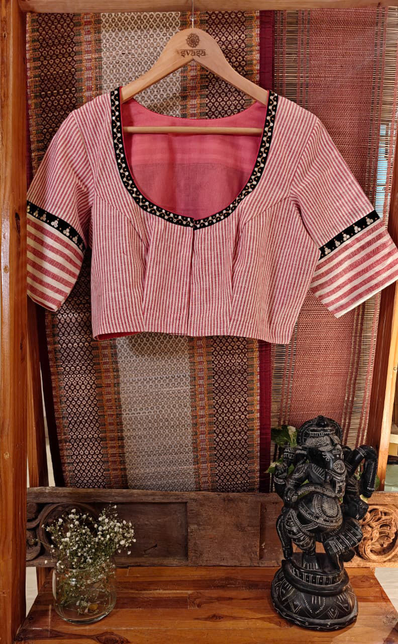 Soft pastel pink stripes paired with a striking paisley border in charcoal and ivory. Delicately embellished with mirrors, this handloom cotton piece balances subtle colour with classic detail. Timeless, thoughtful, and unmistakably a Svasa classic.