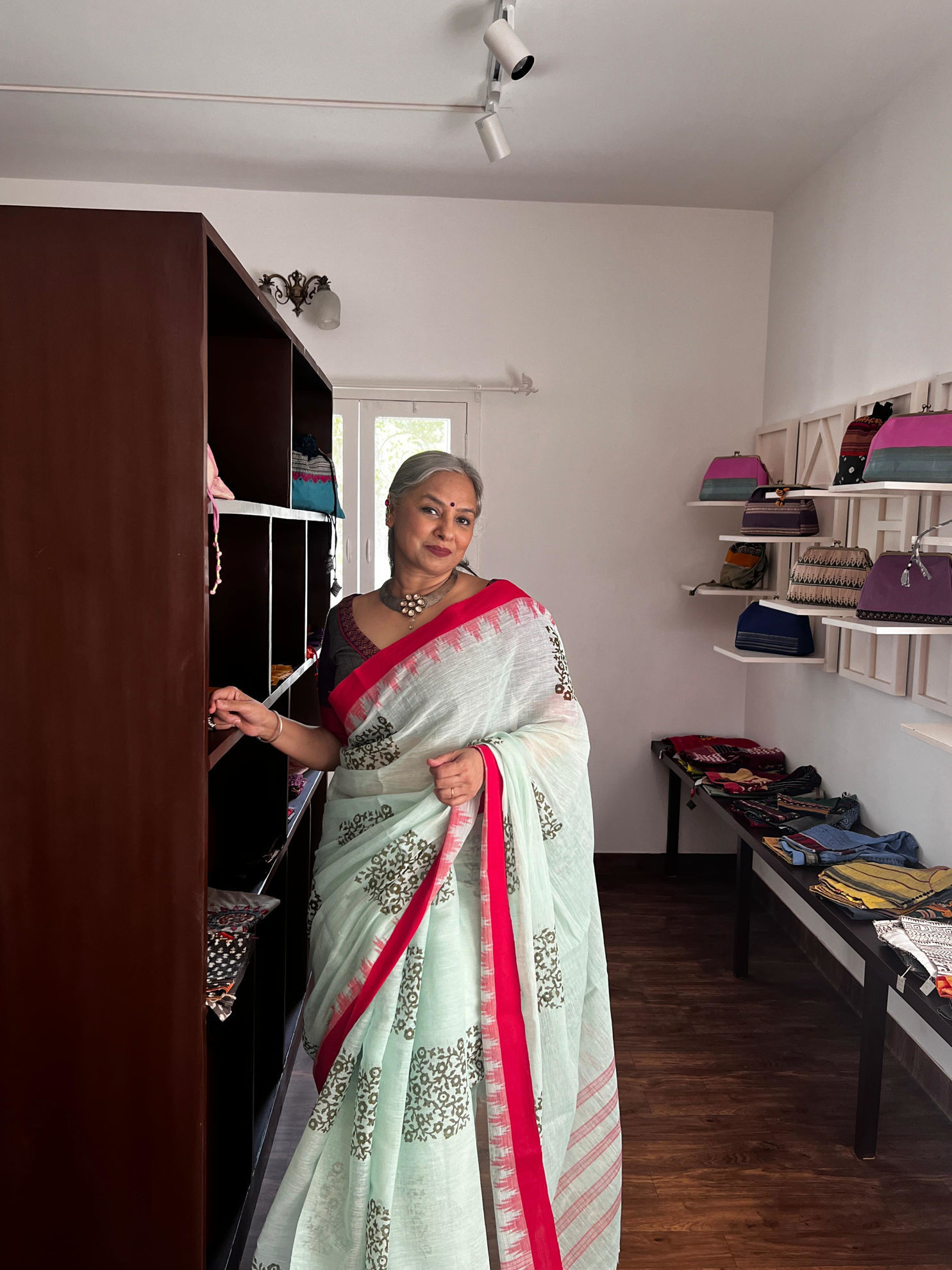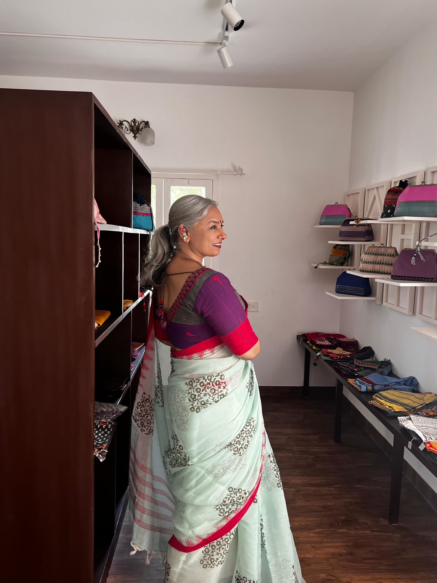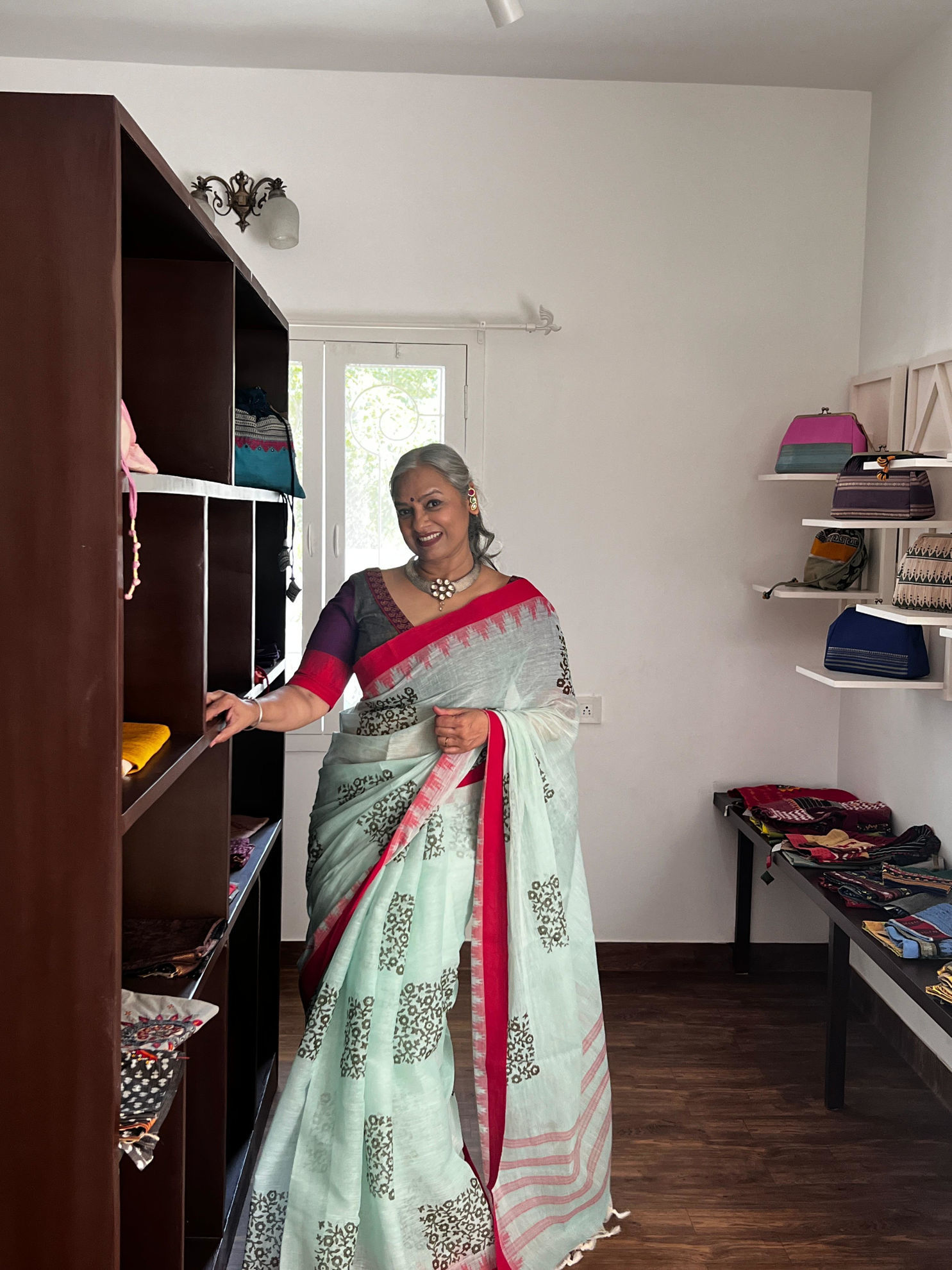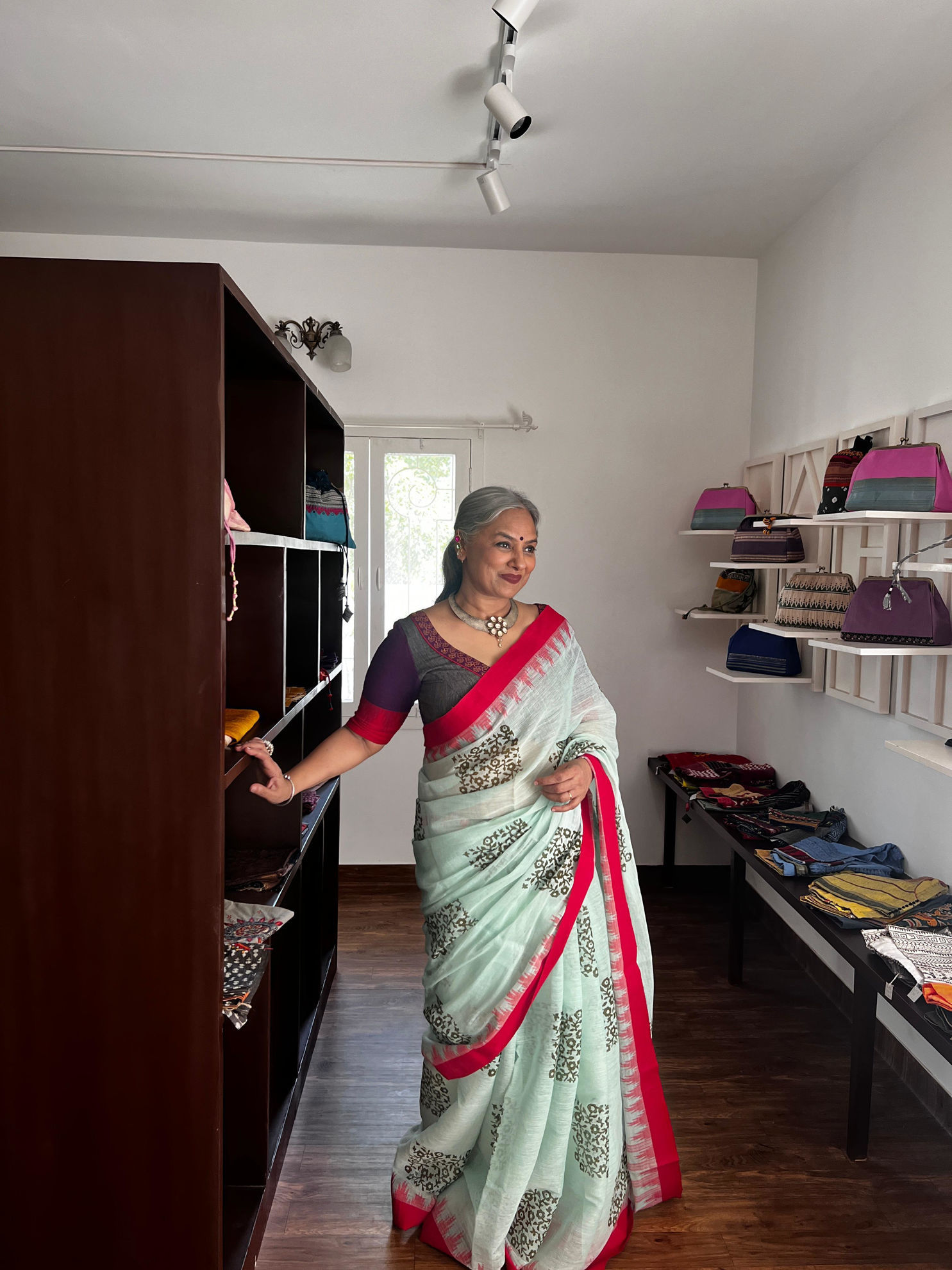 A soothing pista-hued Ponduru khadi, brought to life with a striking red border that frames it with quiet contrast. Light, breathable, and rooted in handspun beauty, this saree carries an understated charm that stays with you. Please note: The ready blouse worn in the images is not included in the saree cost.