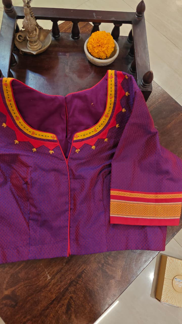 Our artisans creatively hand embroider, hand paint and hand print the blouses that come to you from the design house of SVASA. We use hand woven fabric extensively. You may notice very minute, almost insignificant flaws in the crafts since they are all handmade. We urge our patrons to overlook a few human errors that may have occurred in the process. Our aspirations are towards an empowered society, focusing on keeping traditional needlecraft alive for a long time to come.