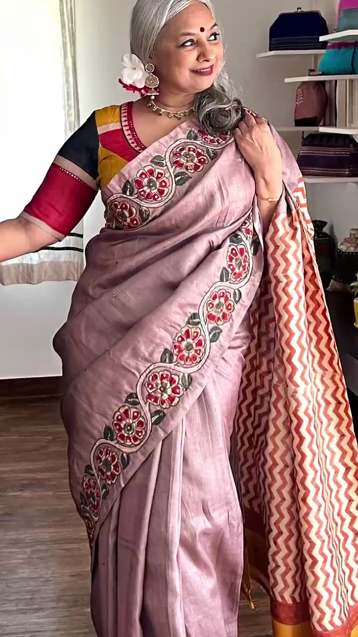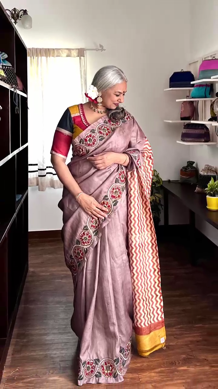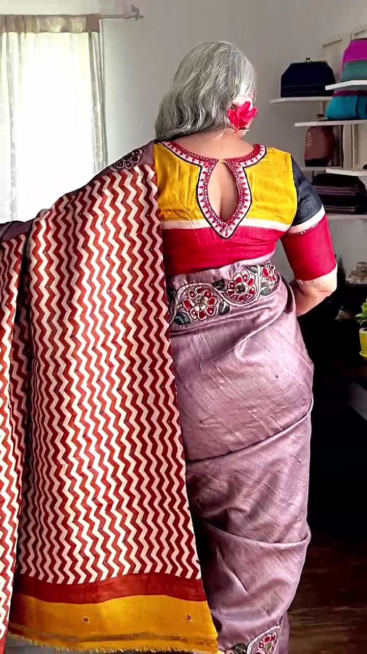 A light brown tussar, brought alive with an unusual appliquéd Kalamkari—each motif intricately embroidered, holding stories within its threads. Paired with a canary yellow unstitched blouse that adds just the right lift of colour. Please note: The ready blouse shown is not included with the saree.