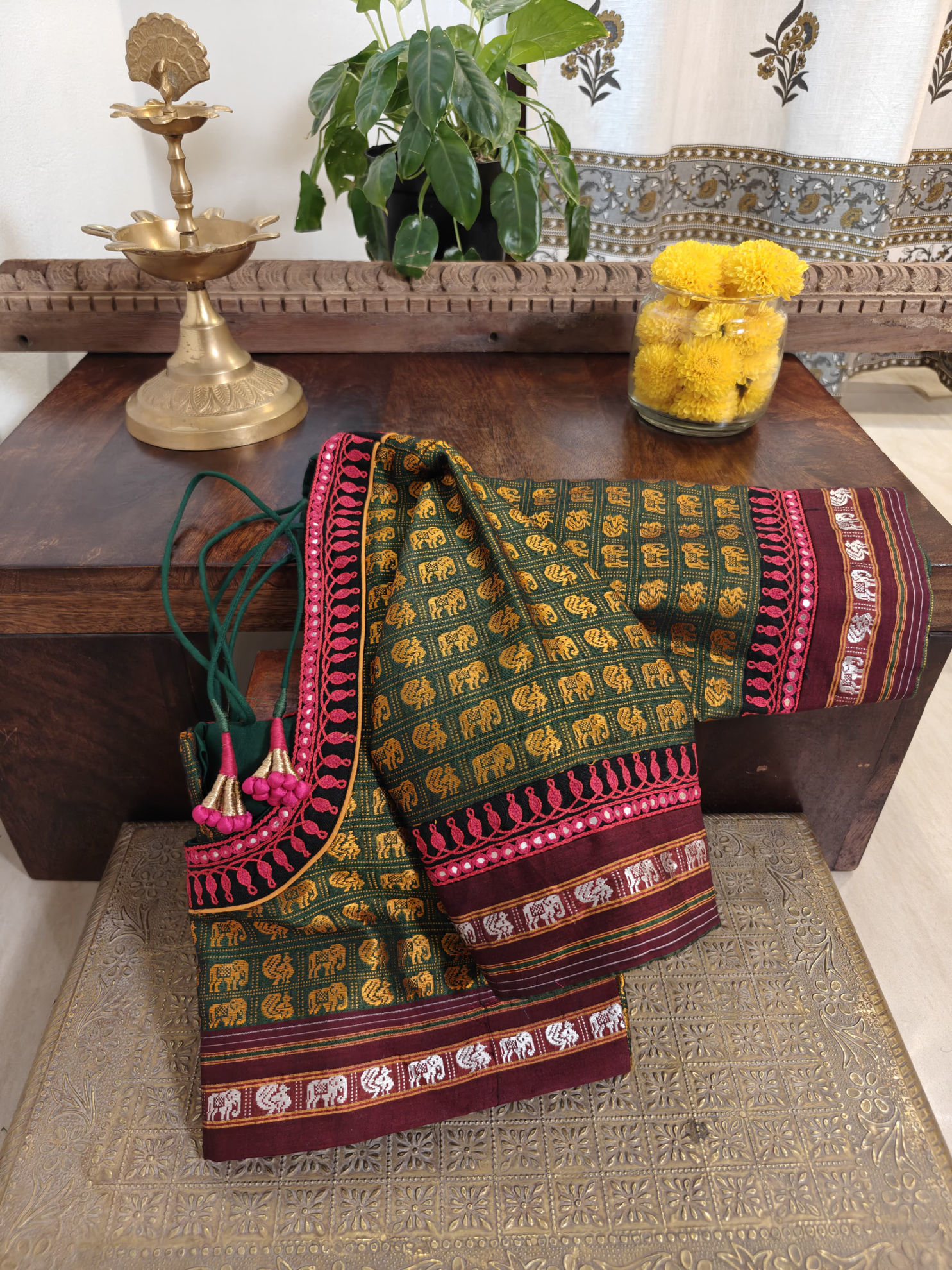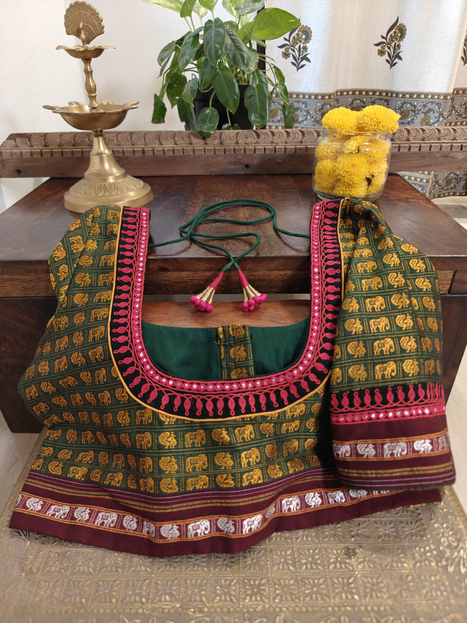 In tender green with vibrant red and a dash of ivory — colors that carry the warmth of tradition. Our khun blouse features an embroidered border tracing the neckline, a subtle handmade flourish that enriches the weave’s timeless beauty. Woven in heritage, finished the Svasa way, and made to be worn for years to come.