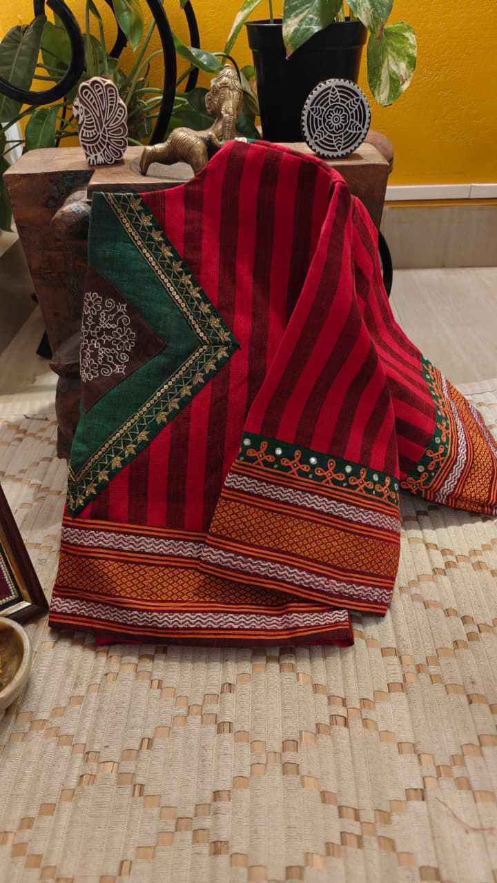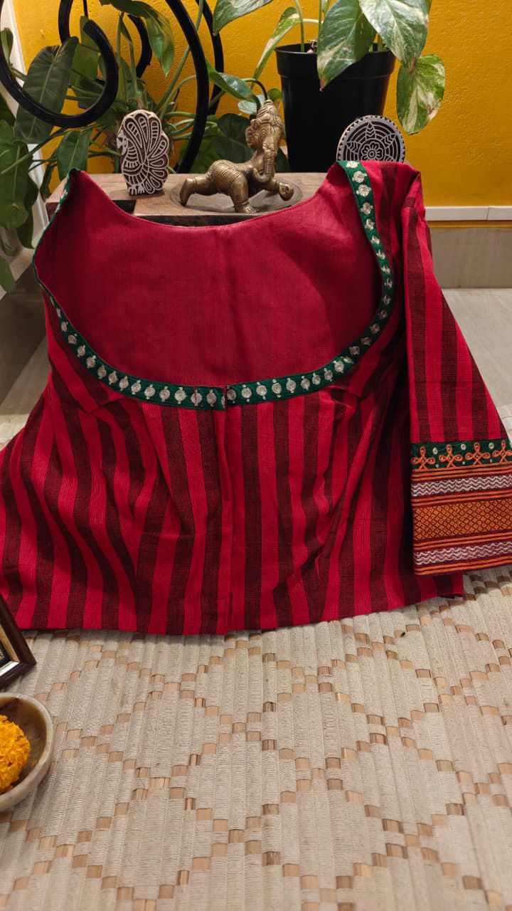 Classic Kandangi cotton stripes in striking red set a vibrant, rooted tone — unapologetically traditional and full of character. A rich green yoke anchors the piece, creating that unmistakable contrast the weave is loved for.