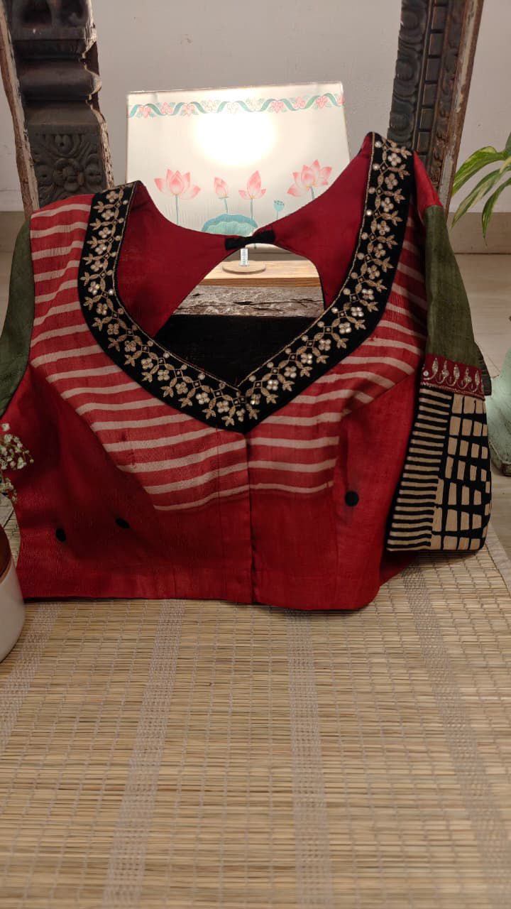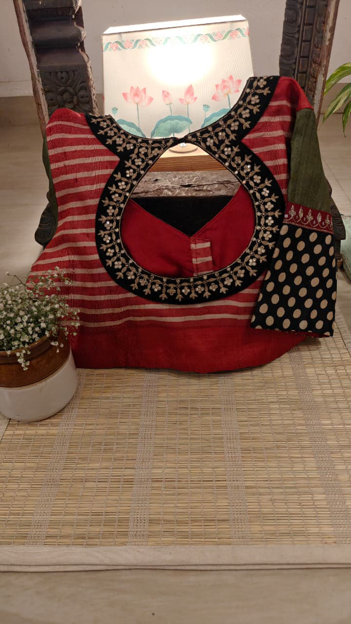 Handmade block-printed tussar silk in red stripes, paired with green and a charcoal–ivory polka border for that striking contrast. Finished with antique gold embroidery around the neck, this piece carries a rich, timeless charm — crafted the Svasa way.