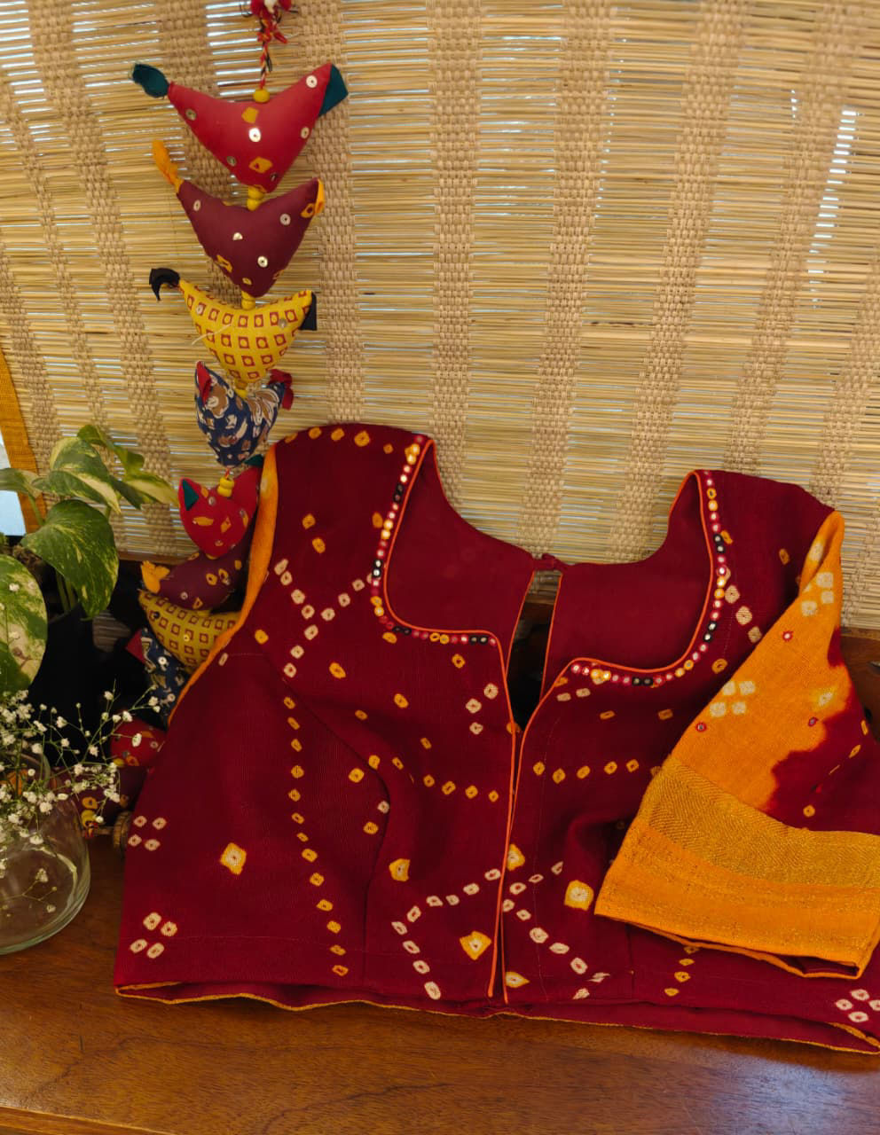 A colourful bandhani crafted in a thick, textured weave, alive in vibrant red and sunlit yellow. Happy mirror borders frame the piece beautifully, adding sparkle and movement with every glance. Bold, festive, and full of cheer, this blouse celebrates colour, craft, and the unmistakable joy of bandhani done the Svasa way.