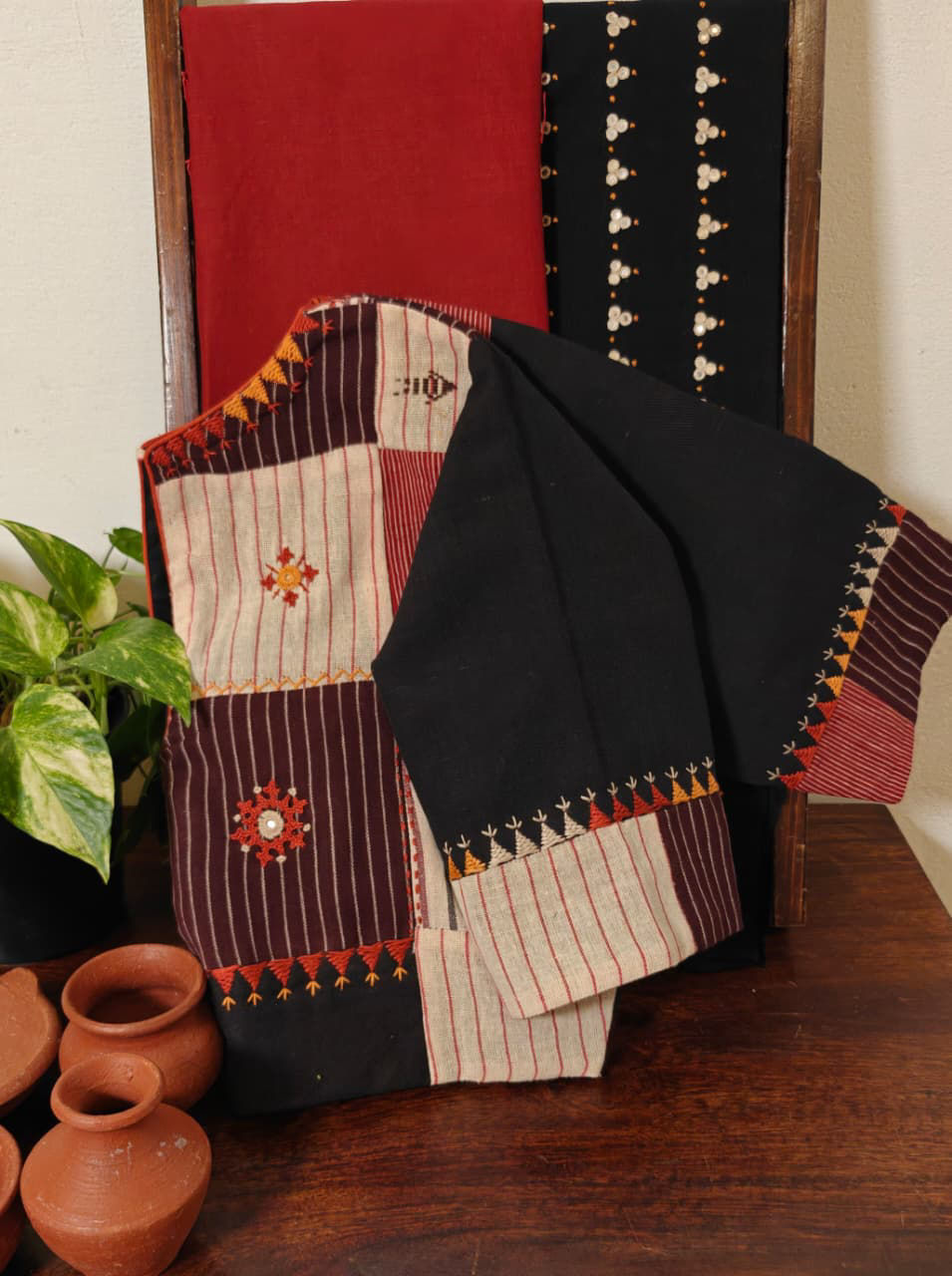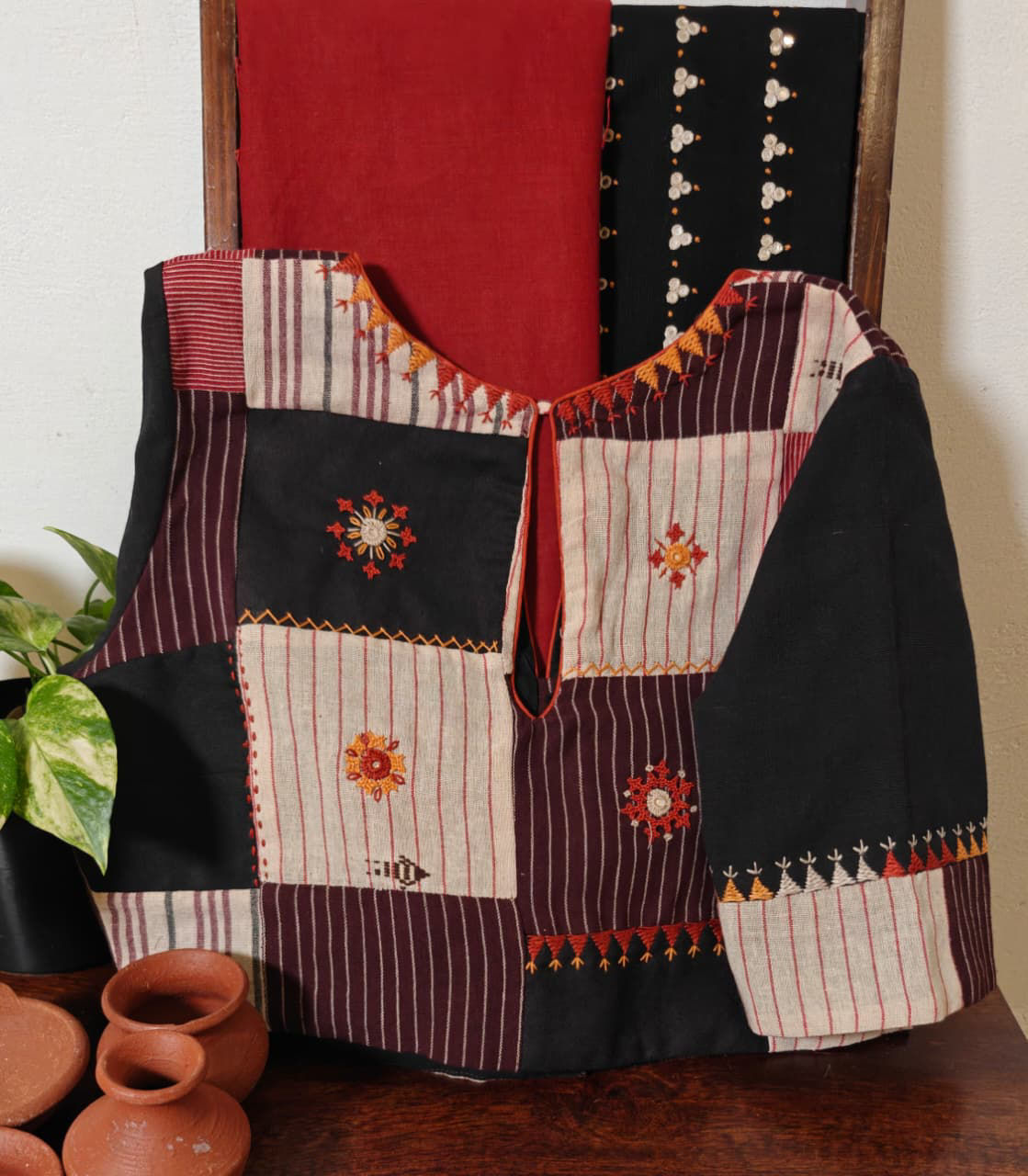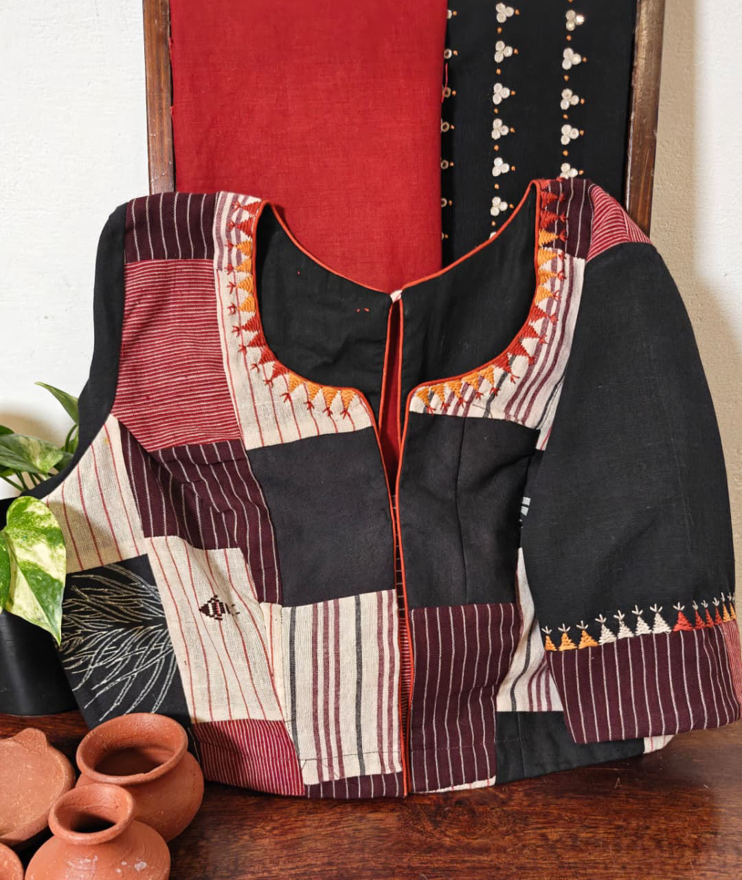Patches of rustic Kotpad weaves, fused together with abstract embroidery. A story of sustainable craft, tradition revived, and heritage reimagined. 🌿πŸͺ‘