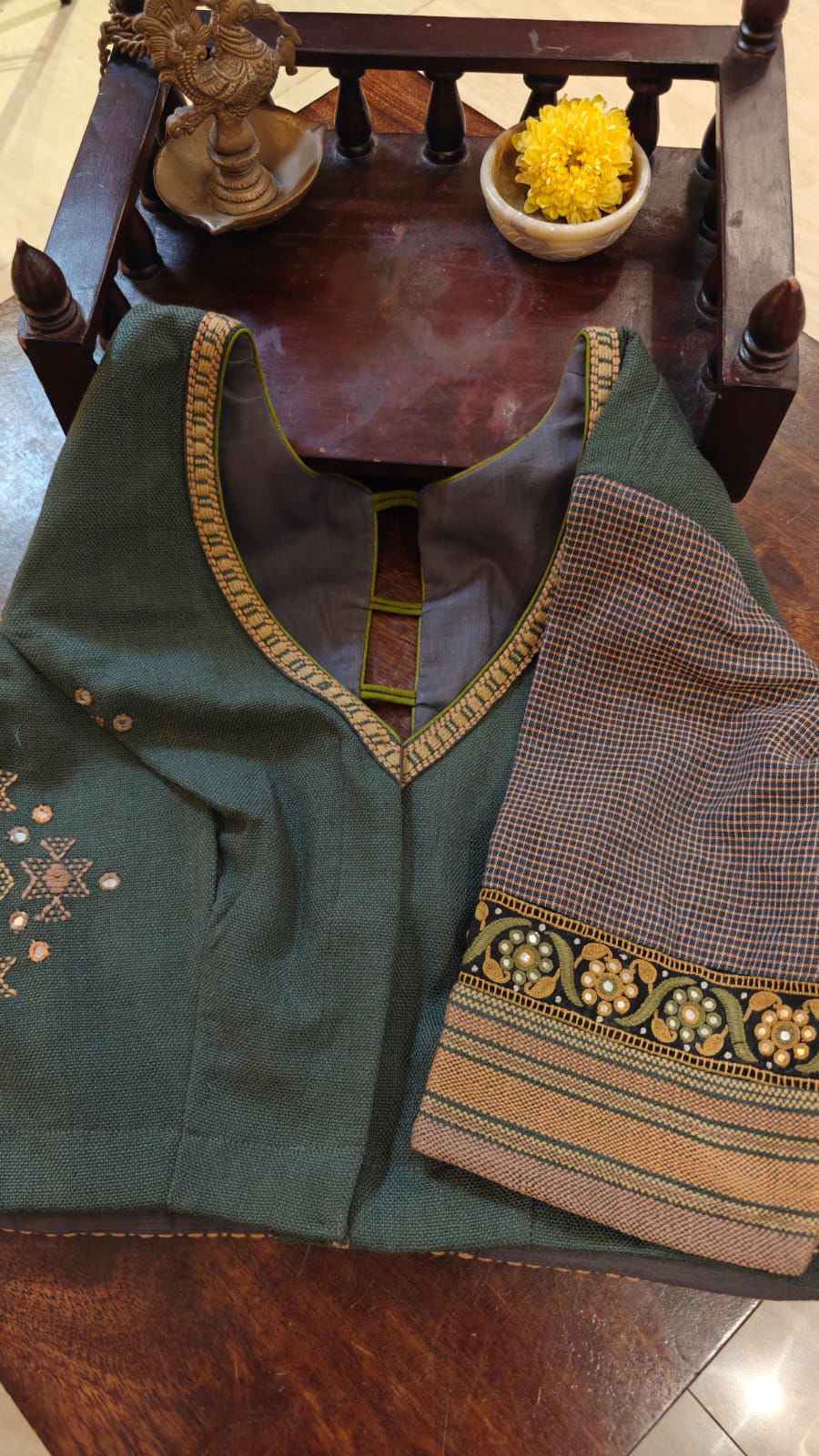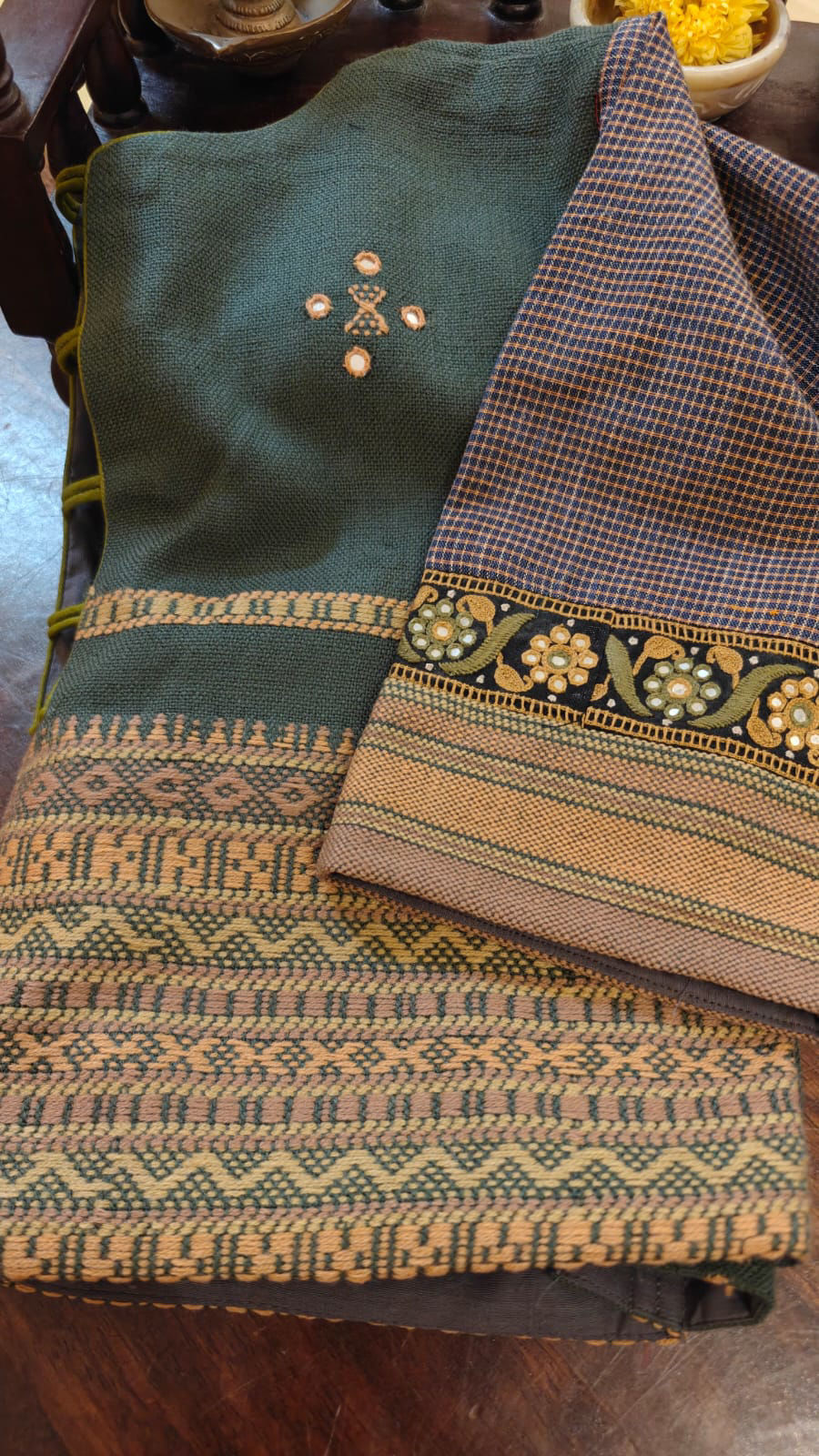 Sage green Bhujodi cotton paired with warm ochre tones, brought alive through thick, rustic tribal embroidery. The texture is bold, the stitches intentional, carrying the raw strength of indigenous craft. Part of the Bhumi narrative, this cotton piece is grounded and earthy—where tradition is worn with quiet confidence and natural ease.