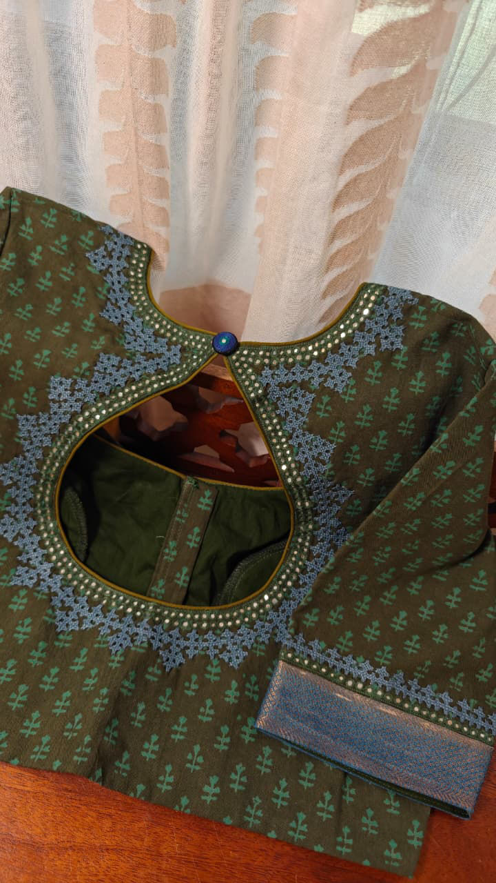 Our artisans creatively hand embroider, hand paint and hand print the blouses that come to you from the design house of SVASA. We use hand woven fabric extensively. You may notice very minute, almost insignificant flaws in the crafts since they are all handmade. We urge our patrons to overlook a few human errors that may have occurred in the process. Our aspirations are towards an empowered society, focusing on keeping traditional needlecraft alive for a long time to come.