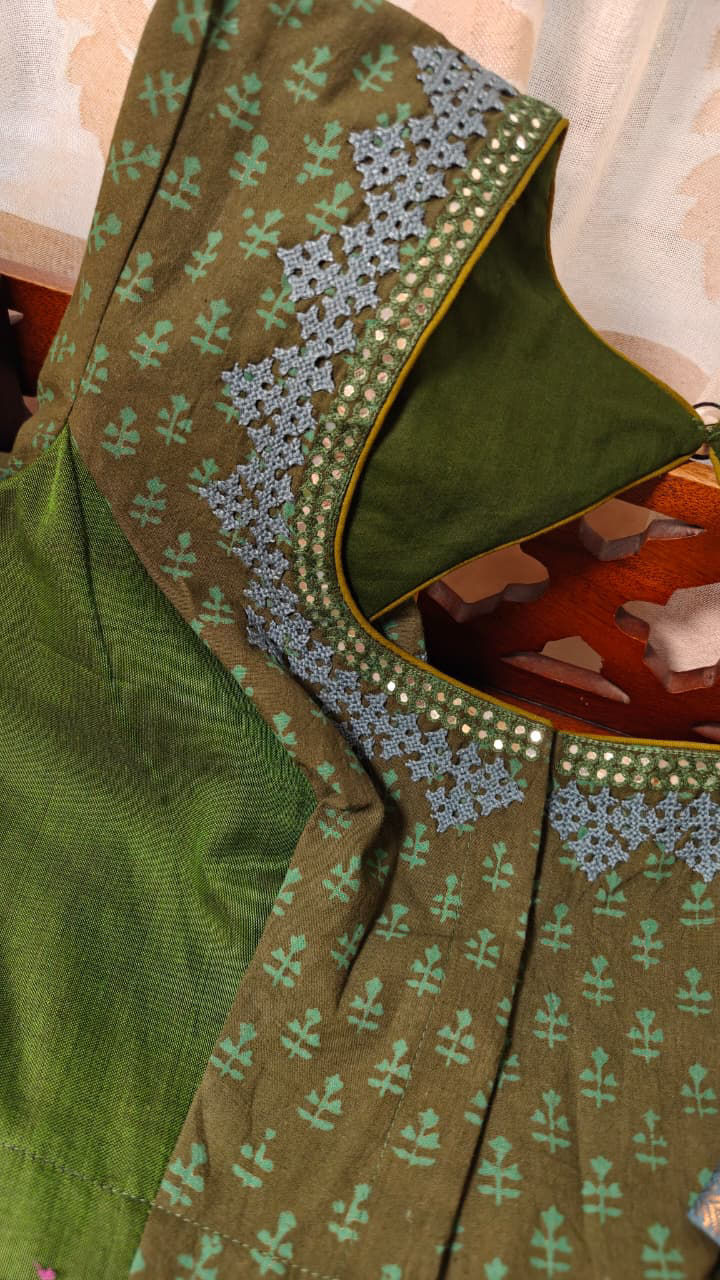 A sage-hued block printed cotton handloom, enriched with thick Kutchi embroidery in a vintage blue. The bold stitches add depth and texture, while a classic embroidered button completes the story with quiet charm. Rooted, tactile, and thoughtfully detailed — a timeless piece with a strong handcrafted soul.