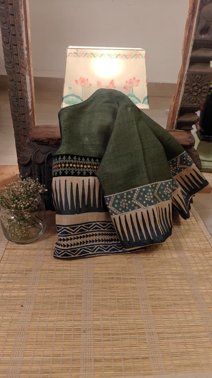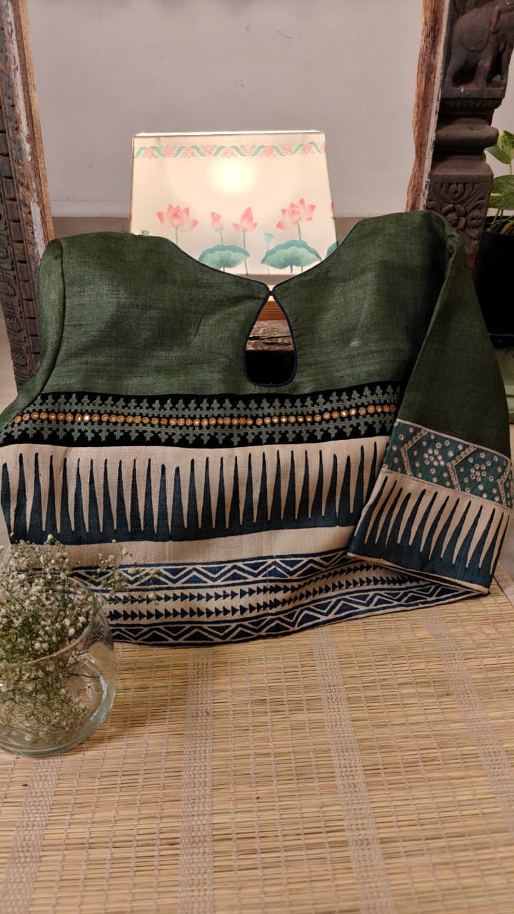 Sage green block prints unfold on pure tussar silk, highlighted with Kutchi embroidery and delicate mirrors in layered shades of blue. Earthy at heart, luminous in detail—crafted to quietly stand apart.