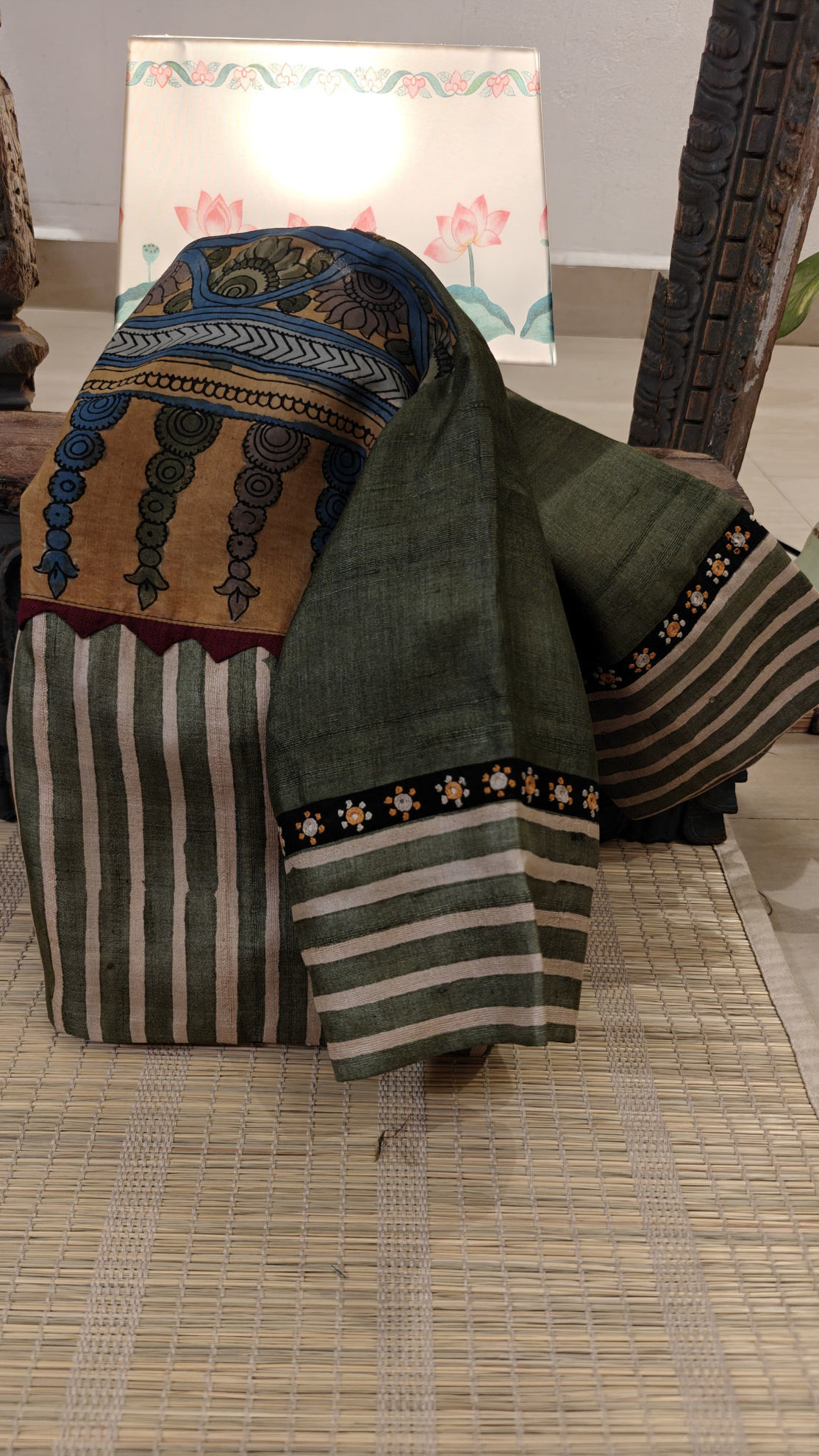 A classic sage tussar silk, soft in tone and texture. The back is kalamkari, hand-painted in earthy shades — the kind that feel lived-in and timeless. The front and sleeves carry tribal embroidered borders, stitched in rhythm, thread by thread. Each piece is hand blocked, each detail placed with intention. A blouse that holds craft, memory, and quiet beauty.
