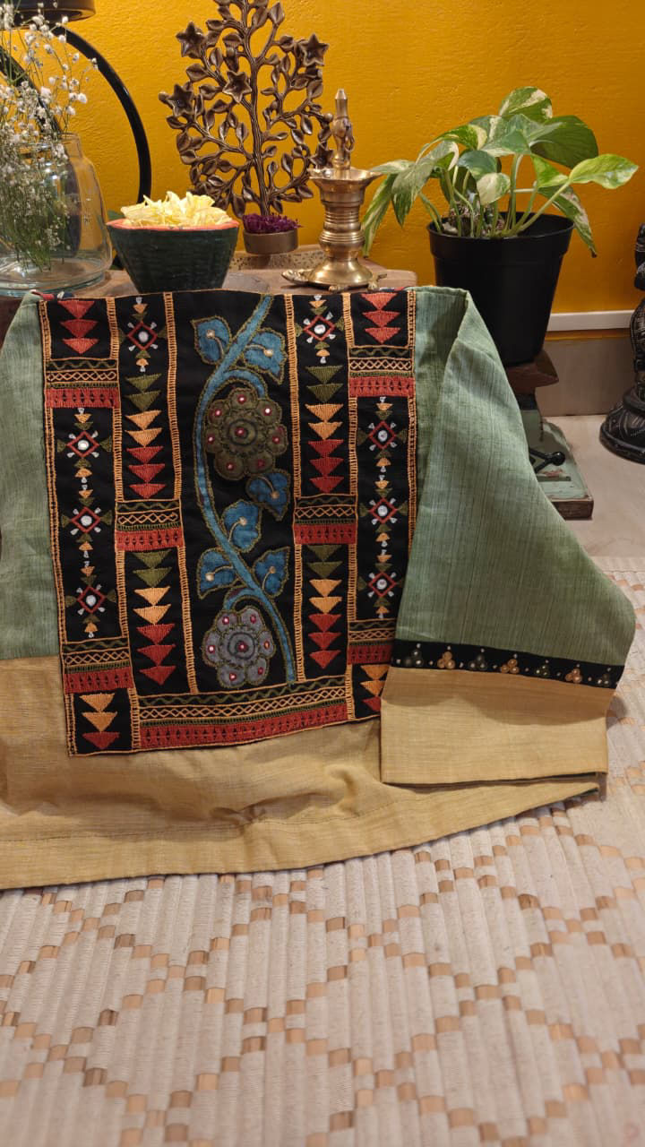 A soothing sage green khadi base paired with a striking charcoal yoke, embroidered in bold tribal motifs. The contrast of earthy tones and textured hand embroidery brings together quiet elegance and rustic character. Rooted in craft and simplicity, this cotton blouse reflects the beauty of handloom traditions with a distinct Svasa touch. ✨