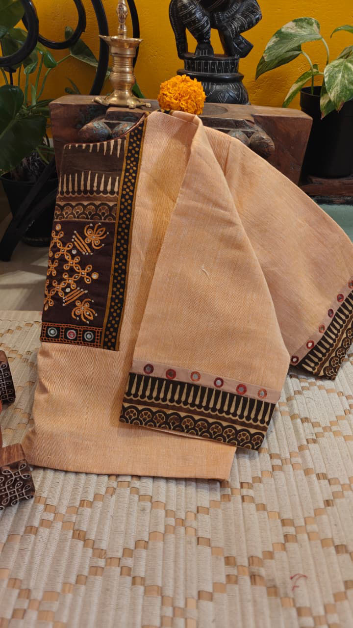 Soft sandal tones come alive with intricate mandala patterns… touched gently with a dash of brown that grounds the palette beautifully. A composition that feels calm, rooted, and thoughtfully detailed— where every motif finds its place with quiet strength.