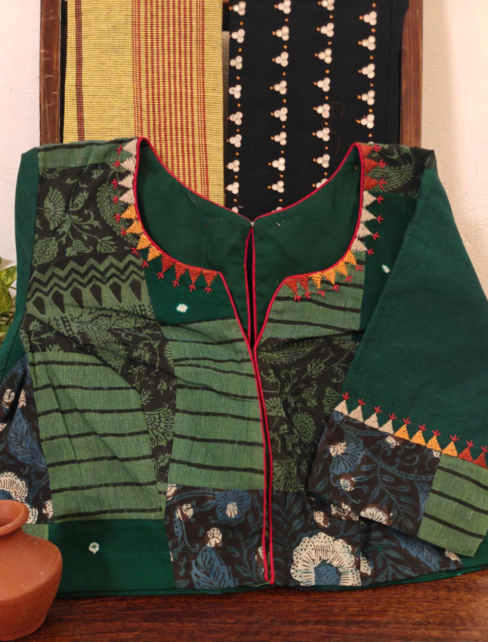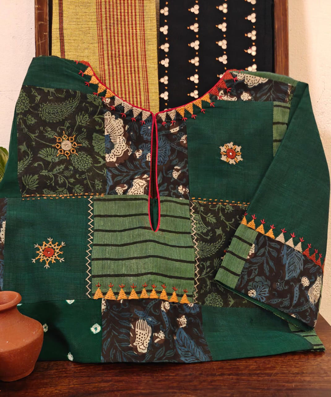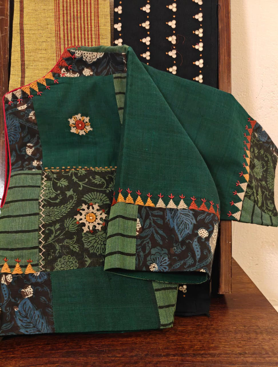 Patches in deep, dark greens — each one from a different weave, a different memory of fabric. Brought together, hand-sewn, and finished with abstract embroidery that feels raw and honest. Sustainable. Recycled. Thoughtful. A blouse that carries the story of re-use with dignity — nothing wasted, everything is given a new life.