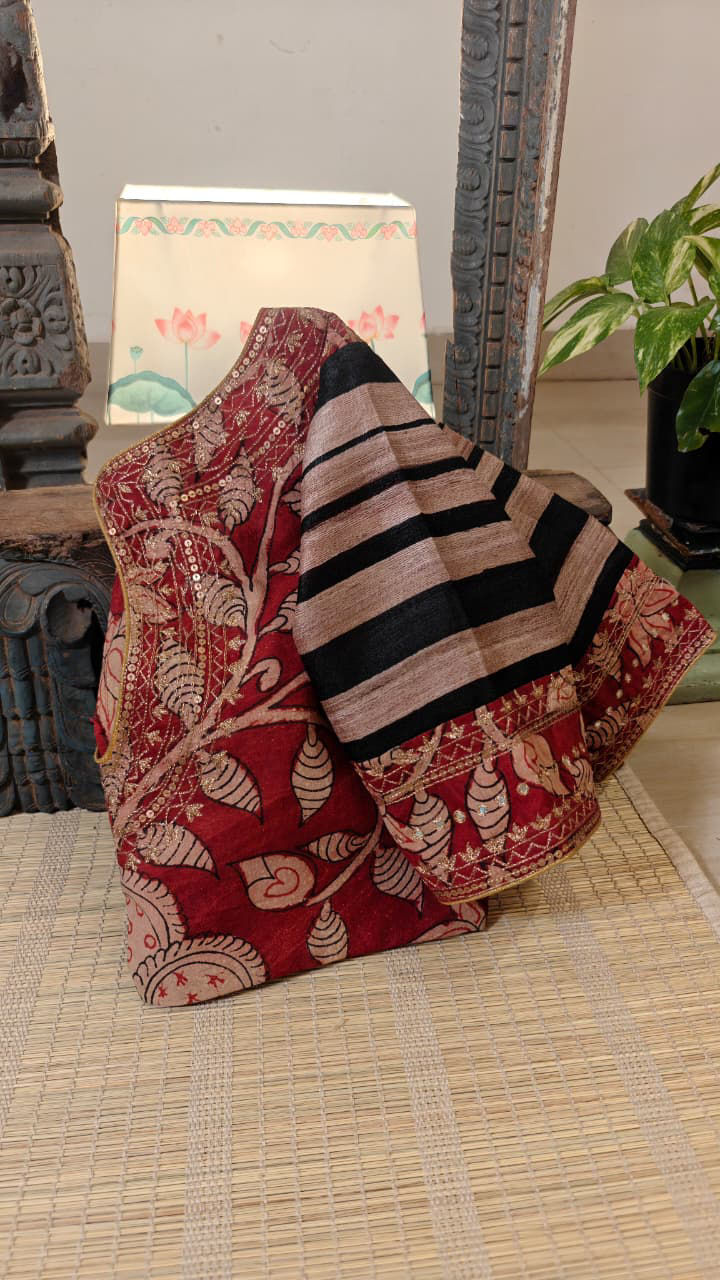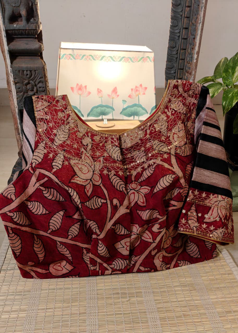 A pure silk kalamkari in rich shades of red… fused with black and white tussar sleeves for that bold contrast. Finished with beaten gold embroidery around the neck and sleeves — subtle, vintage, and unmistakably Svasa. Handmade. Thoughtfully curated. One of a kind. ❤️