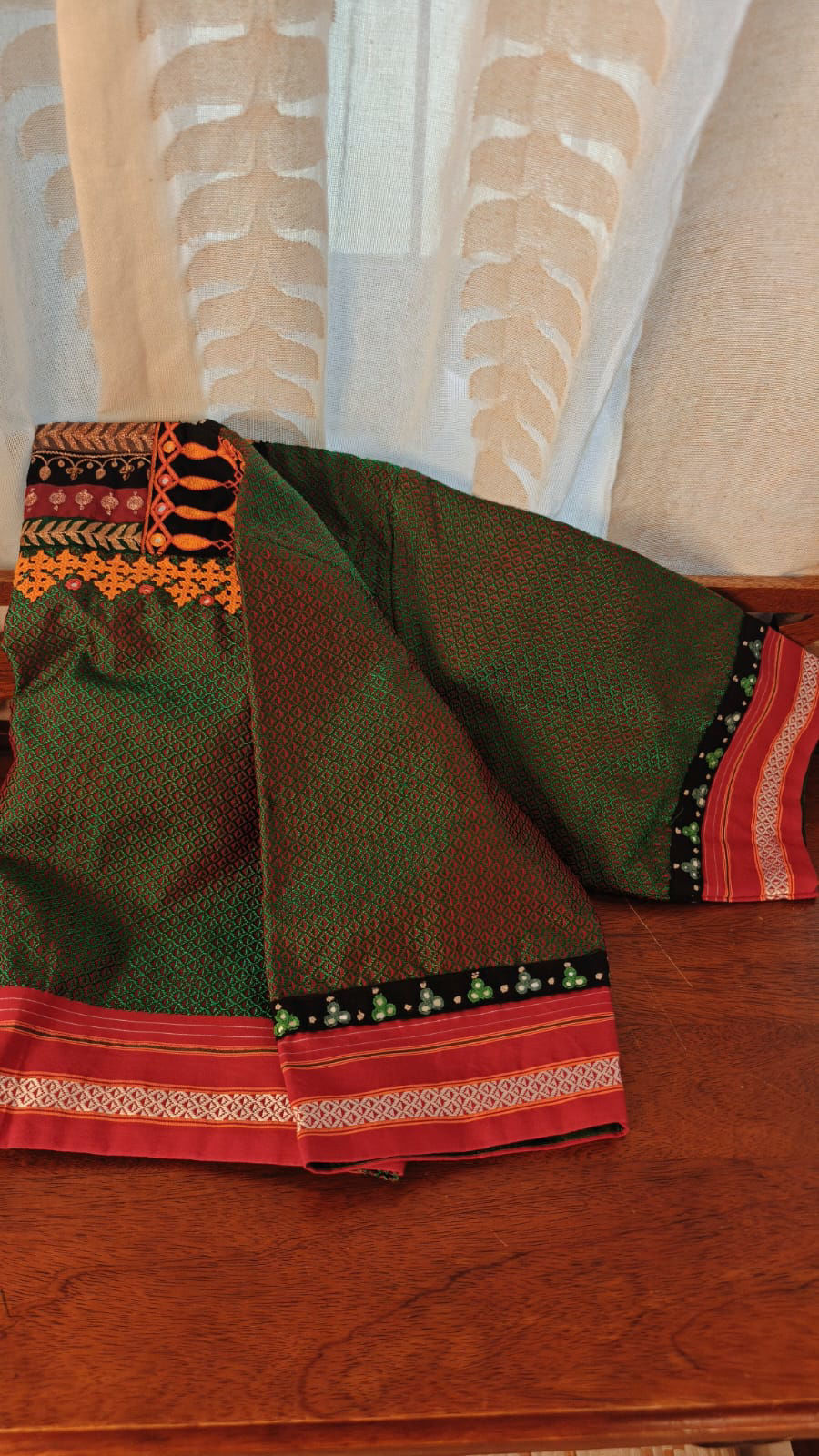 A lighter green Khun brings a gentle, earthy freshness to this blouse—subtle yet full of character. Handcrafted tribal embroidery adds depth and rhythm, each stitch placed with care and quiet intention.