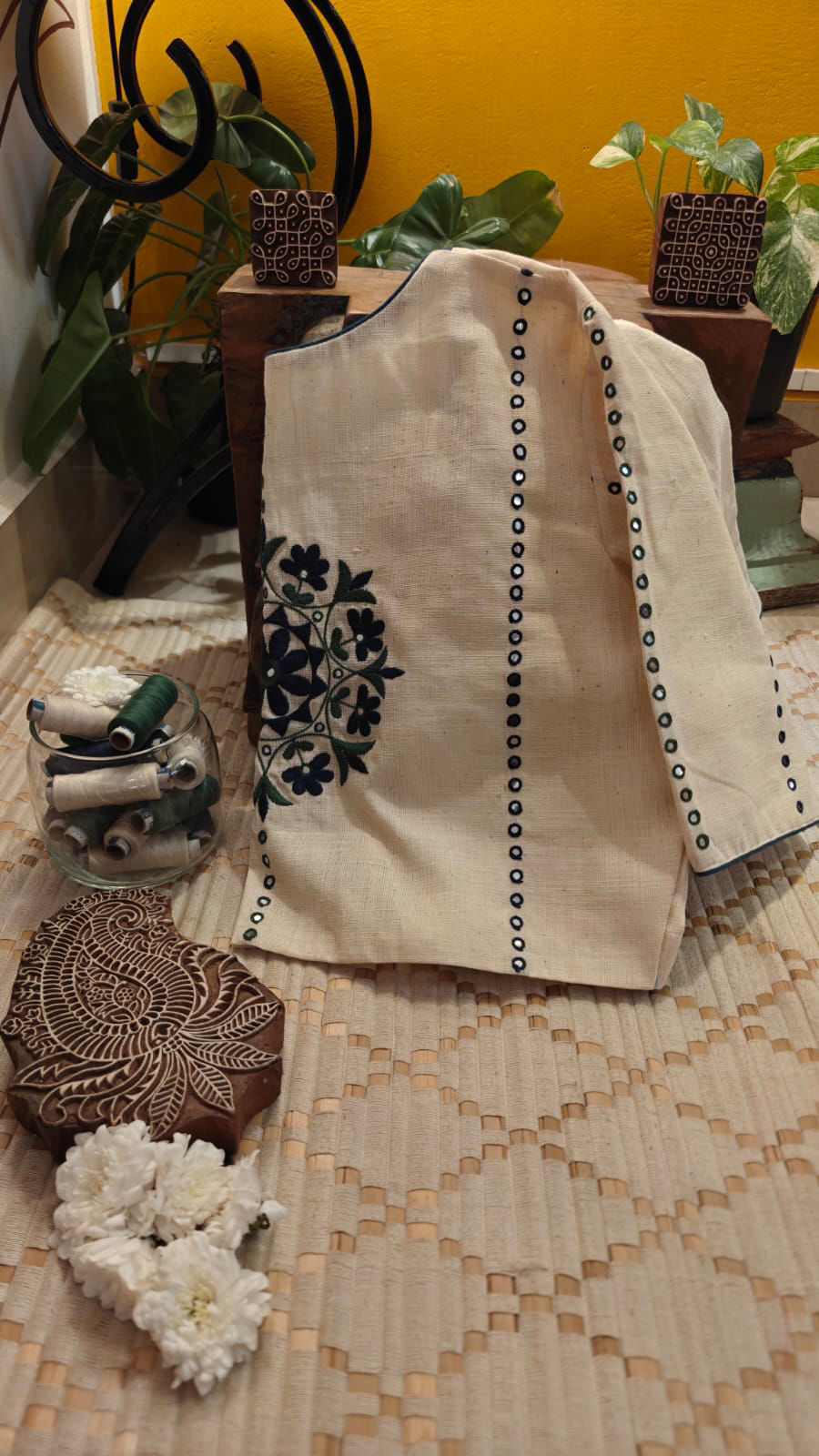Ivory khadi forms a calm, breathable canvas, brought to life with a bold indigo Sunflower motif — striking, grounded, and unmistakable. Rooted in handcraft and simplicity, this design has stood the test of time, becoming one of those pieces that defines the Svasa aesthetic.