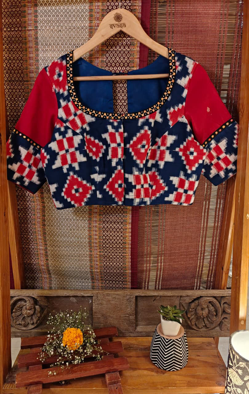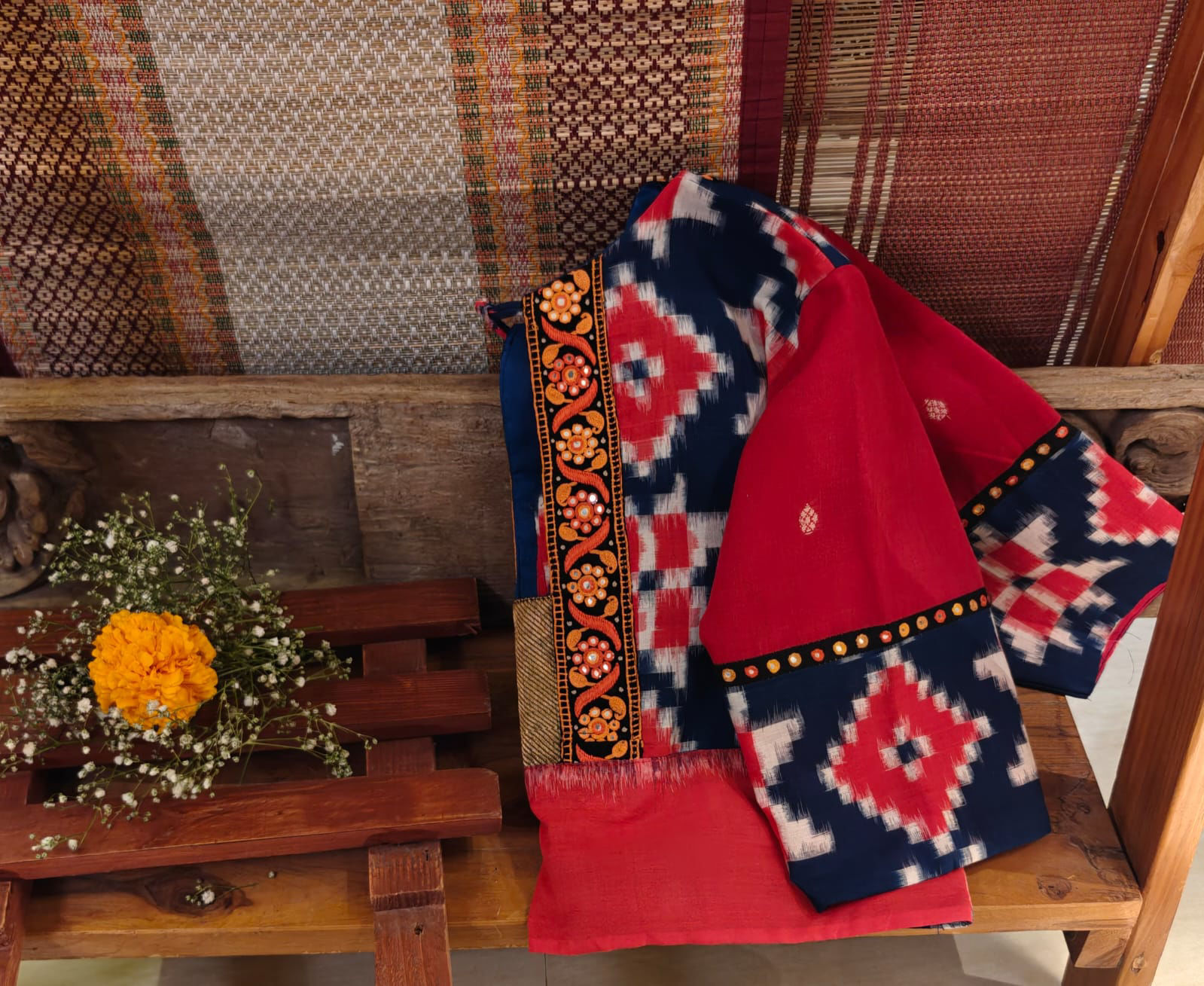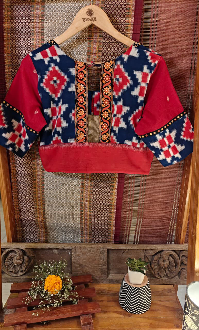 Rooted in tradition and alive with character, this cotton blouse draws inspiration from the timeless beauty of Telia Rumal weaves. The deep blue base meets earthy reds in a dialogue of heritage and craft, while tribal borders come alive with vibrant embroidery and playful mirrors that catch both light and movement.