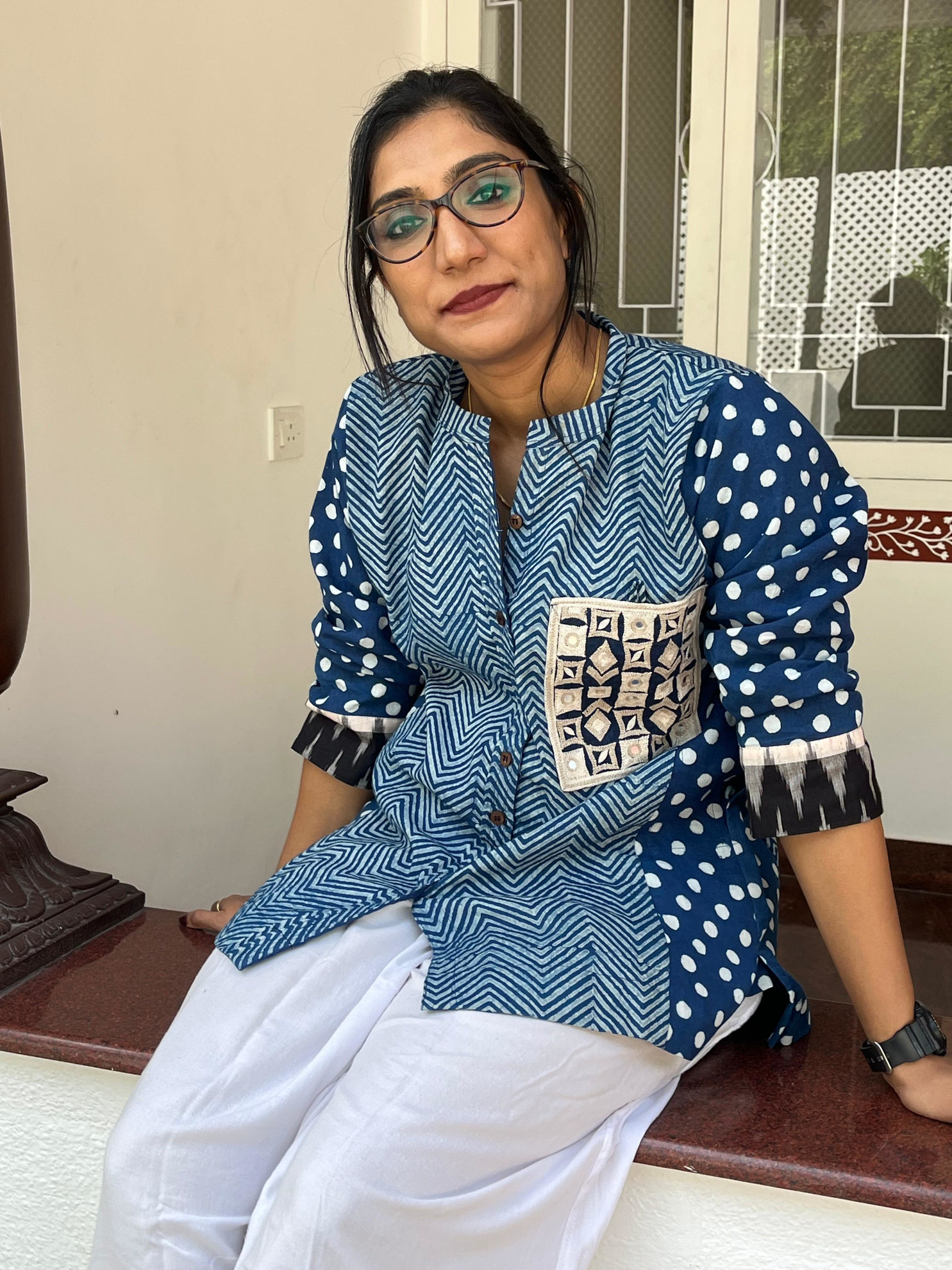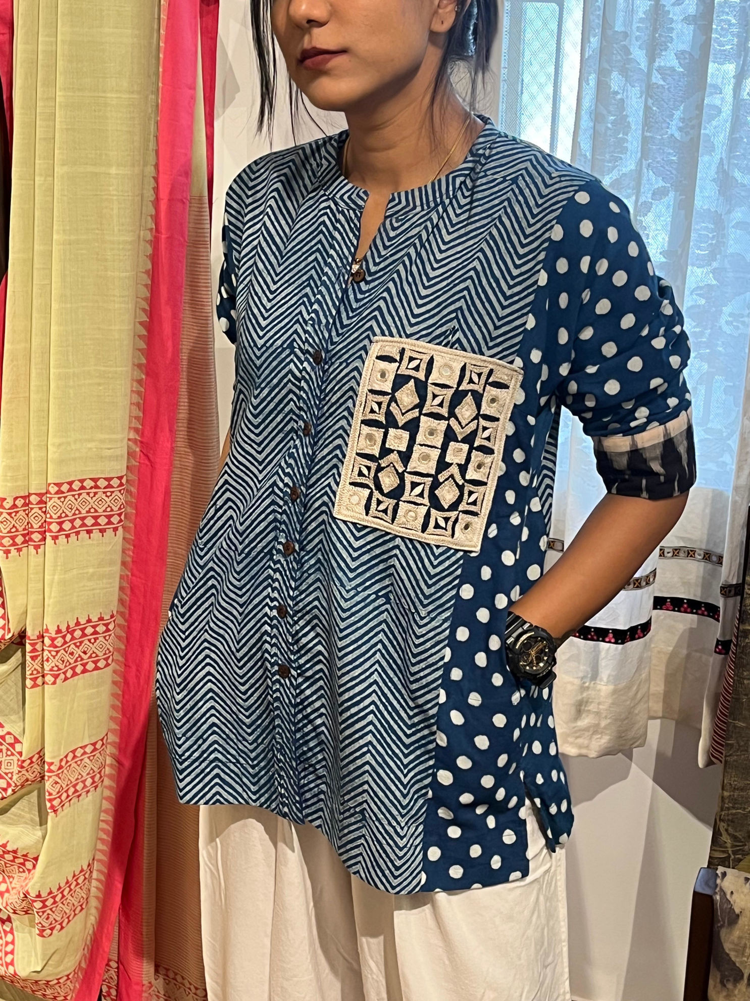 An indigo top designed for effortless styling, pair it with jeans, palazzos, or pyjamas. Finished with thoughtfully crafted tribal embroidered pockets, it’s easy, versatile, and rooted in craft.🦋
