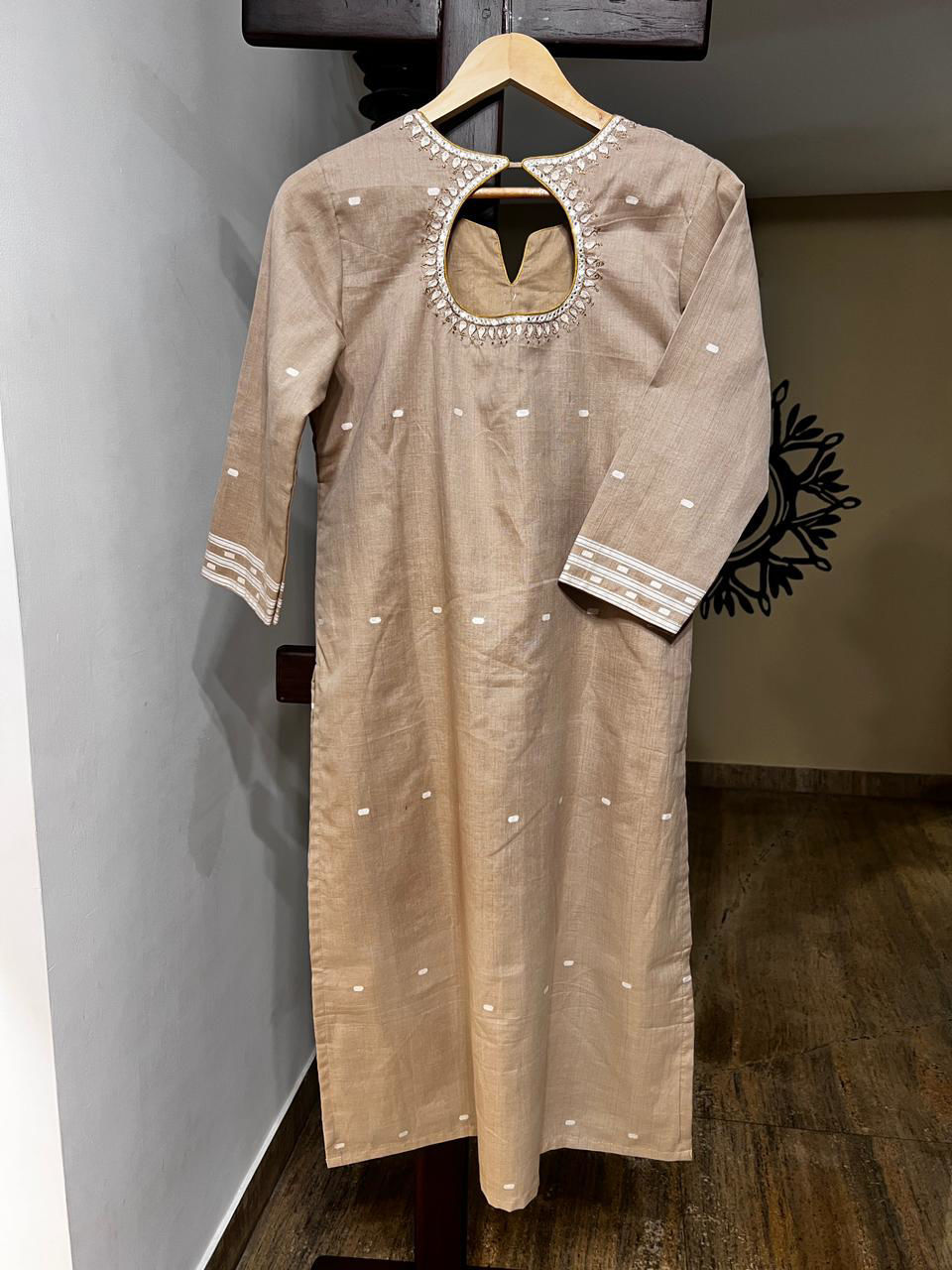A Jamdhani kurta inspired by the timeless weaves of Kolkata. Light, intricate, and woven with care with delicate detailing that extends beautifully to the back, making it just as special from every angle.