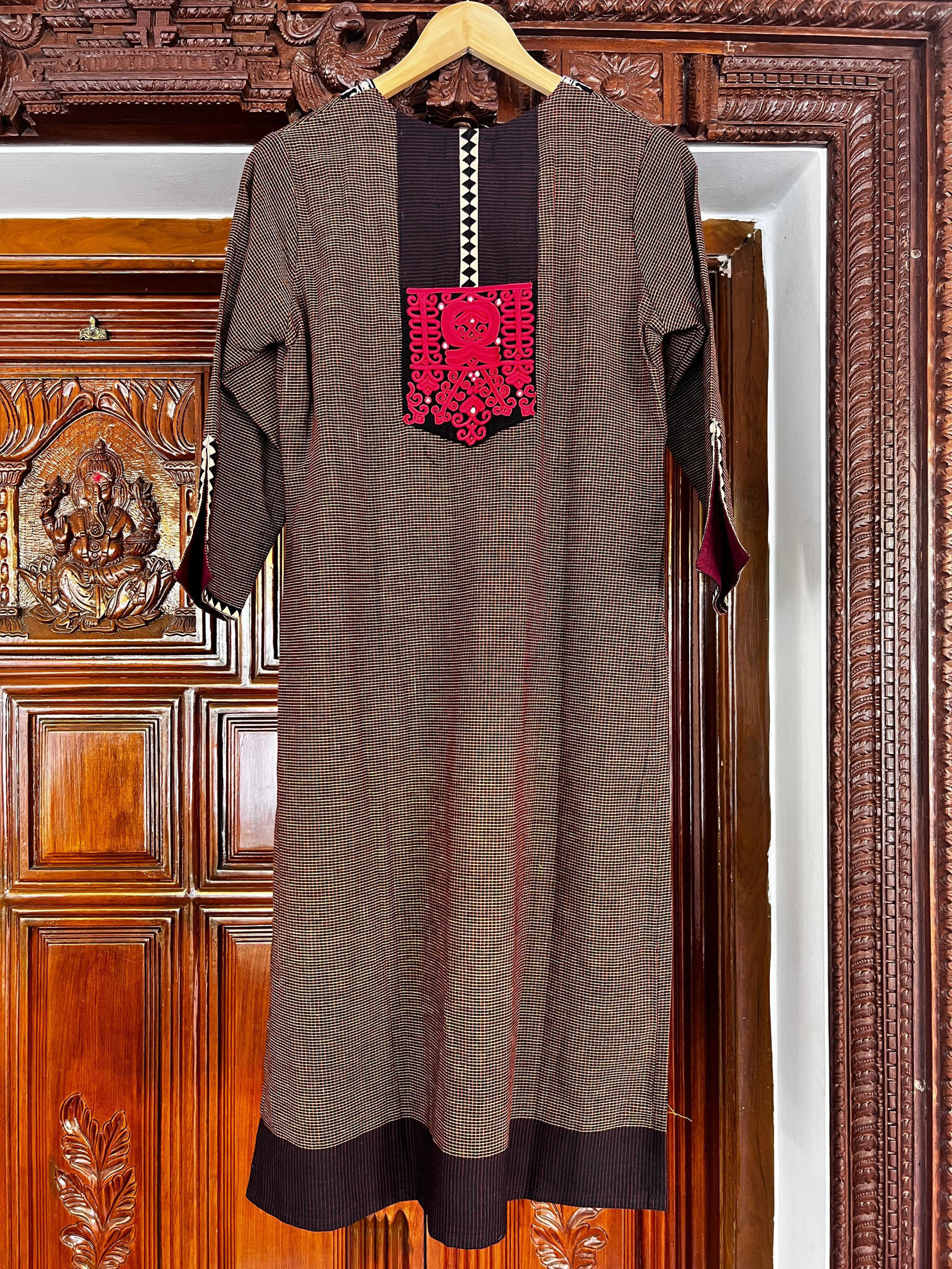 Soft smoky brown brought to life with delicate ivory embroidery. Subtle, elegant, and quietly striking, this piece is all about refined detail and effortless grace. Understated tones, timeless craft, and a silhouette that’s easy to wear. Come see it, feel it, and try it on.