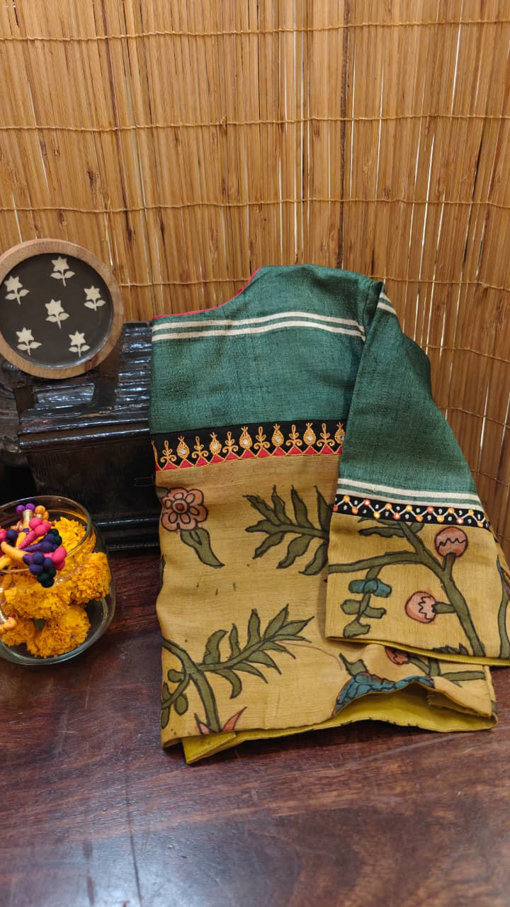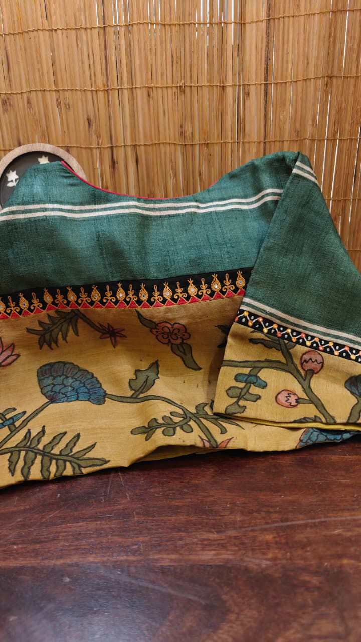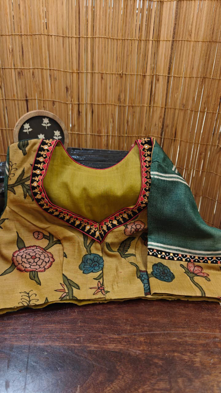 Kalamkari meets hand block prints on rich tussar silk—layered with colorful embroidery that brings every detail to life. A coming together of techniques, each adding its own voice, yet settling into a beautiful harmony. Textured, expressive, and rooted in craft—this is where tradition unfolds in the most vibrant, thoughtful way.