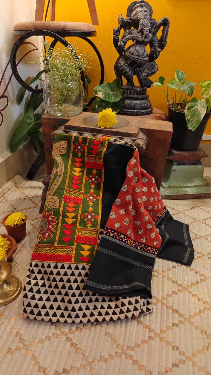 A rich green cotton base sets the tone, layered with hand block prints that carry rhythm and texture. Tribal embroidery adds depth and strength, while Kalamkari appliqué anchors the piece in heritage detail.