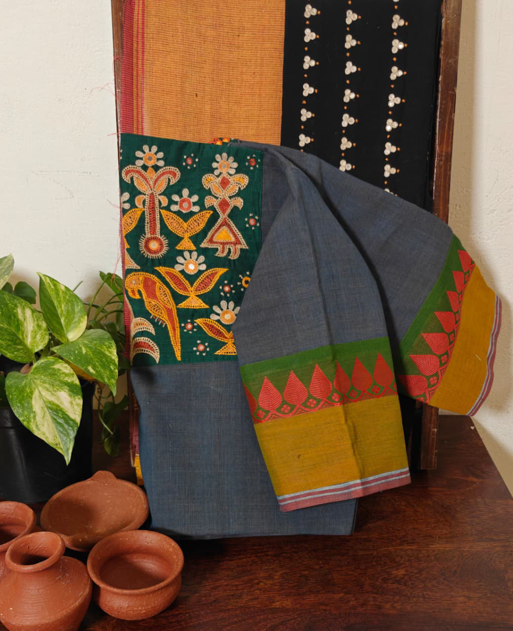 A tribal-inspired yoke in vibrant green set against a bluish-green cotton base. Rustic, bold, and handmade with timeless craft at Svasa. 🪡