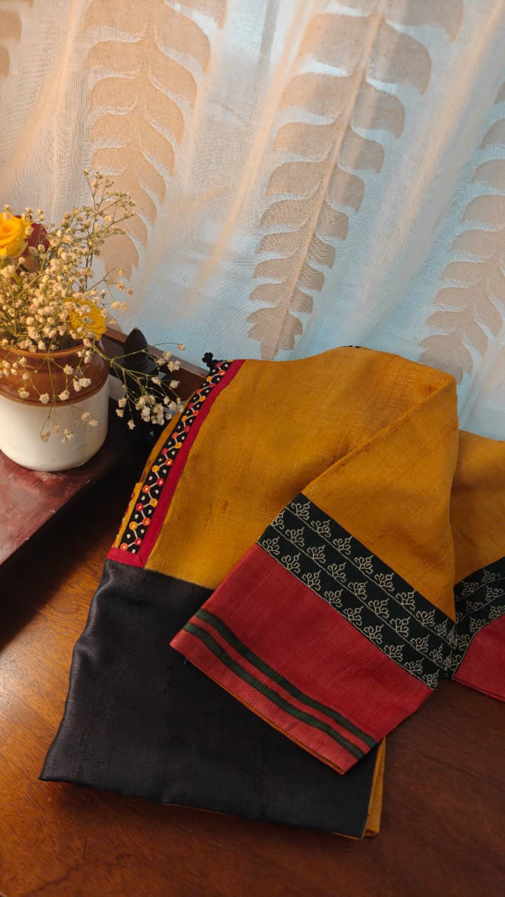 Turmeric, charcoal, red — with just a whisper of green. A palette that never falters. Crafted in pure tussar silk, this piece comes alive with hand embroidery, where Kasuti takes centre stage. Every stitch is deliberate, every detail rooted in tradition, creating quiet magic that feels timeless. A signature Svasa creation, made to be cherished.