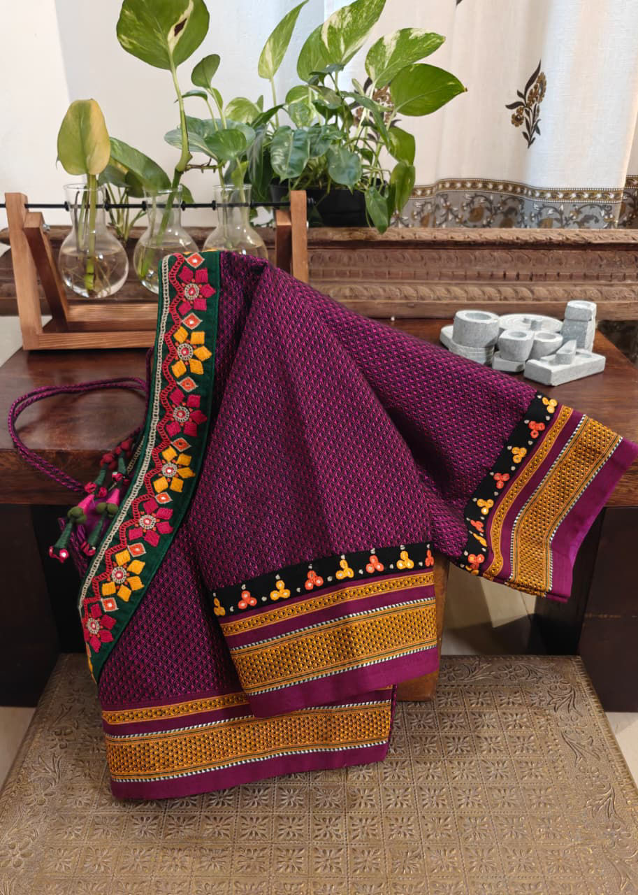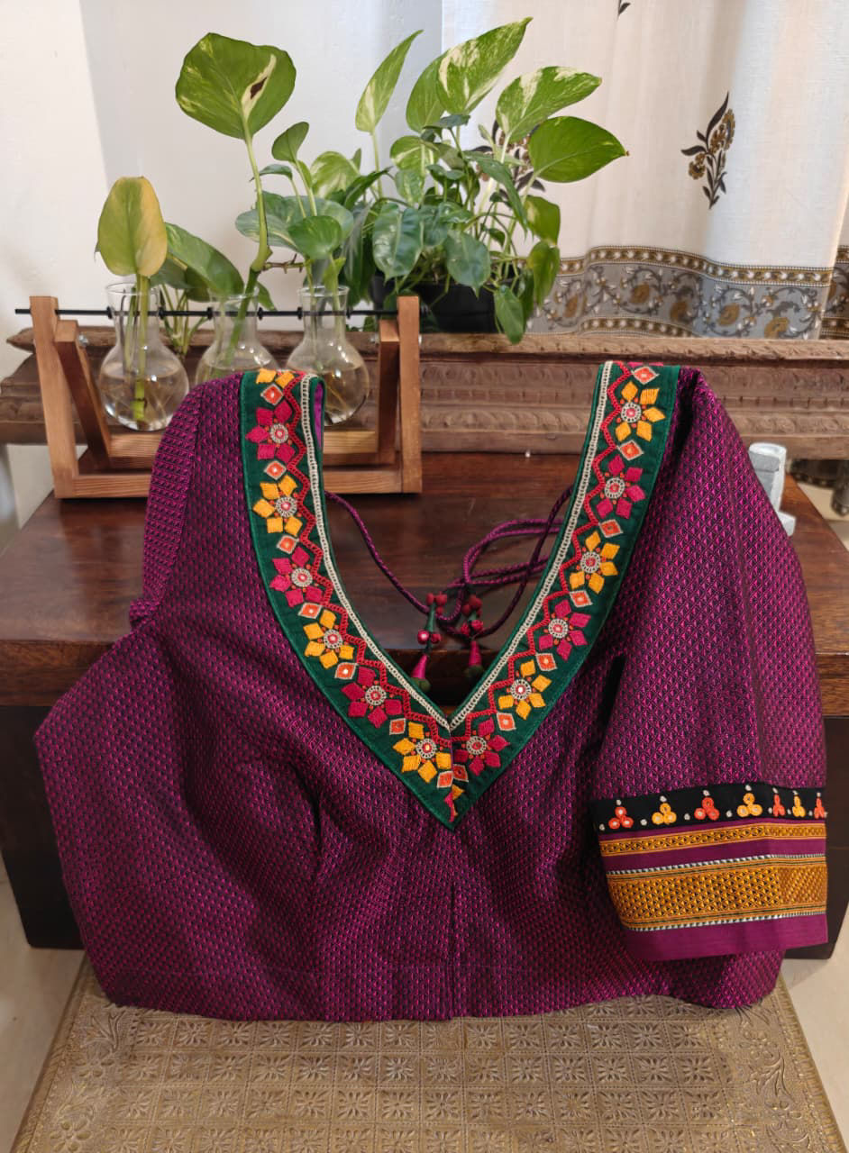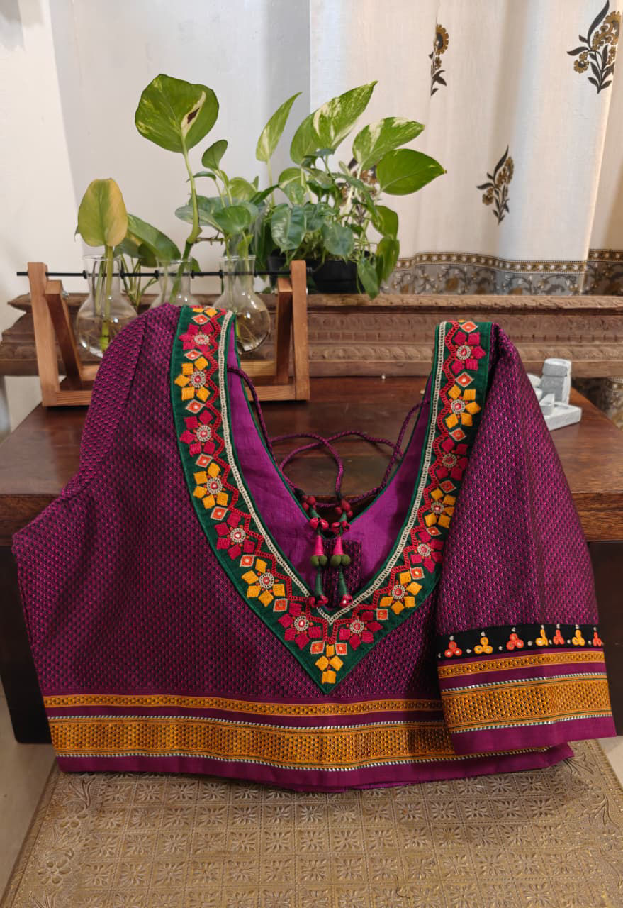 Rich vadamalli khun with vibrant tribal borders along the neck — a burst of colorful hues in every stitch. A blouse that celebrates tradition with a rare Svasa touch. 🪡