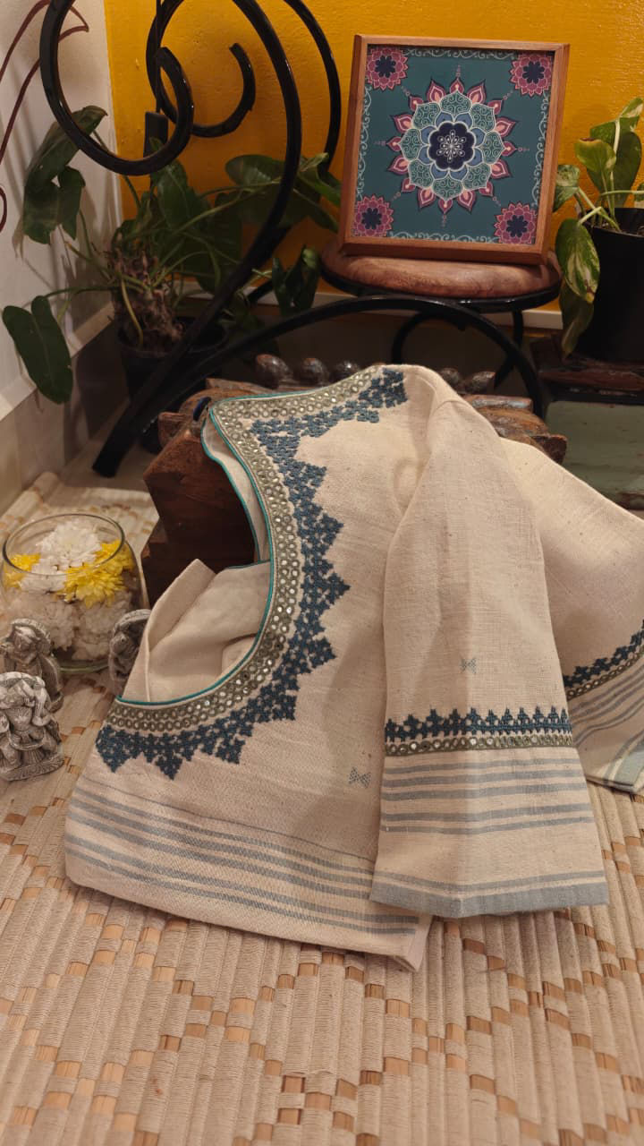 Bhujodi weaves come alive with vintage blue Kutch embroidery, carrying a rustic, tribal spirit. Raw in texture and rich in detail, this piece holds the depth of handcrafted traditions — bold, grounded, and beautifully timeless.