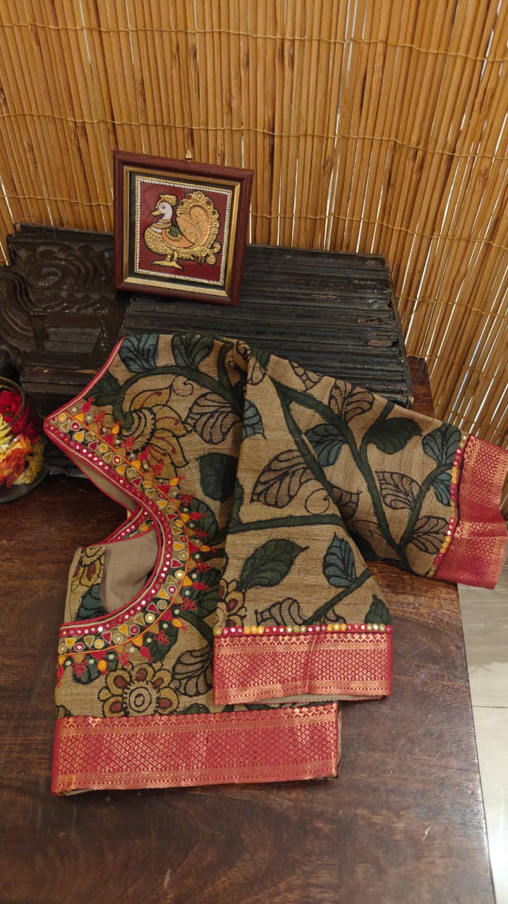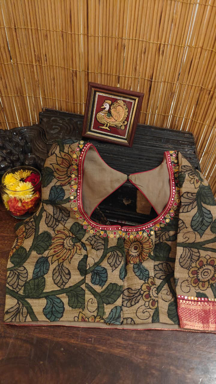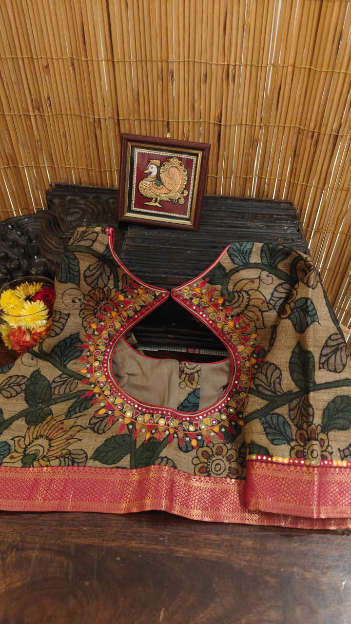 Kalamkari on silk, blooming in soft vintage hues and finely worked threads. Each floral motif unfolds with a quiet charm, carrying the warmth of tradition and the touch of the artist’s hand. Subtle, detailed, and beautifully held—crafted to linger beyond seasons. ✨