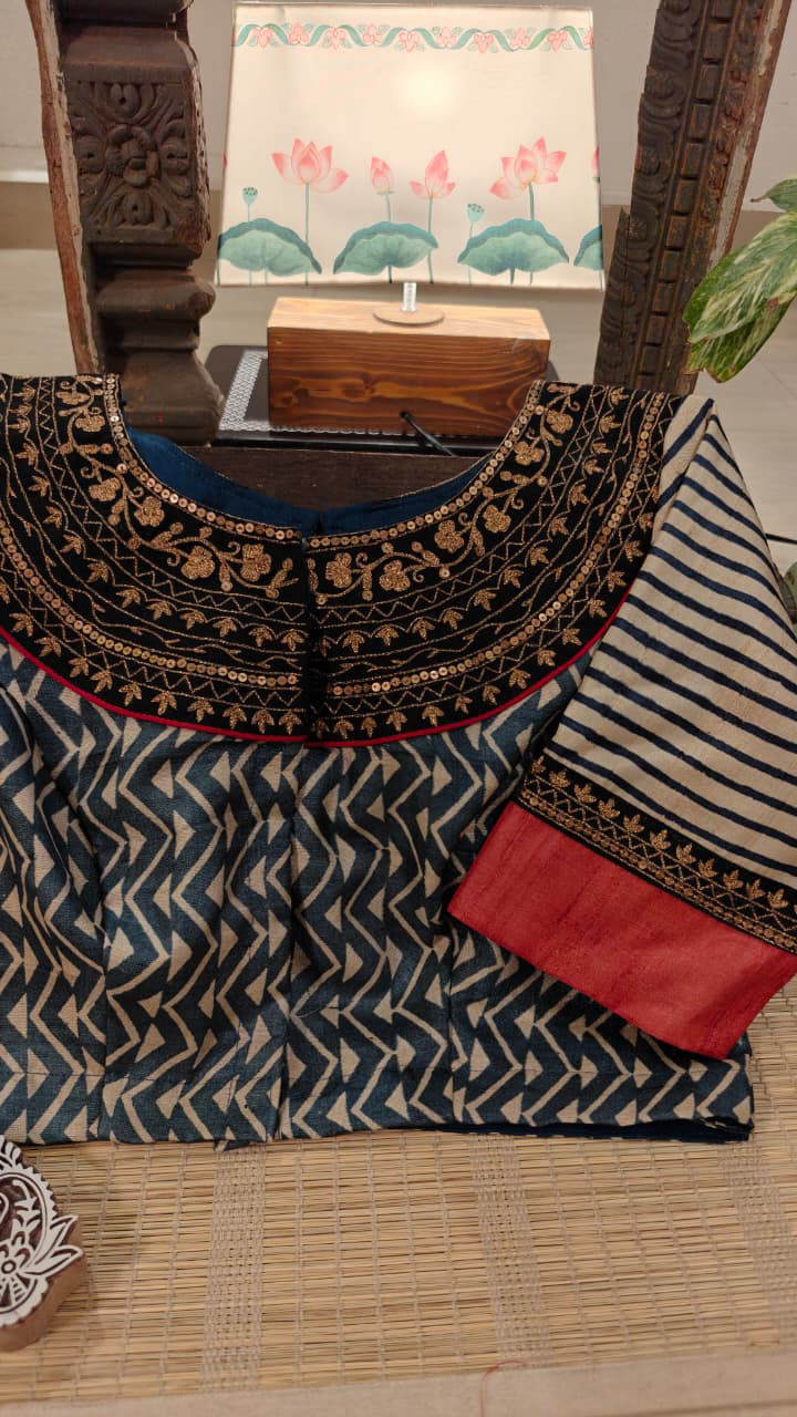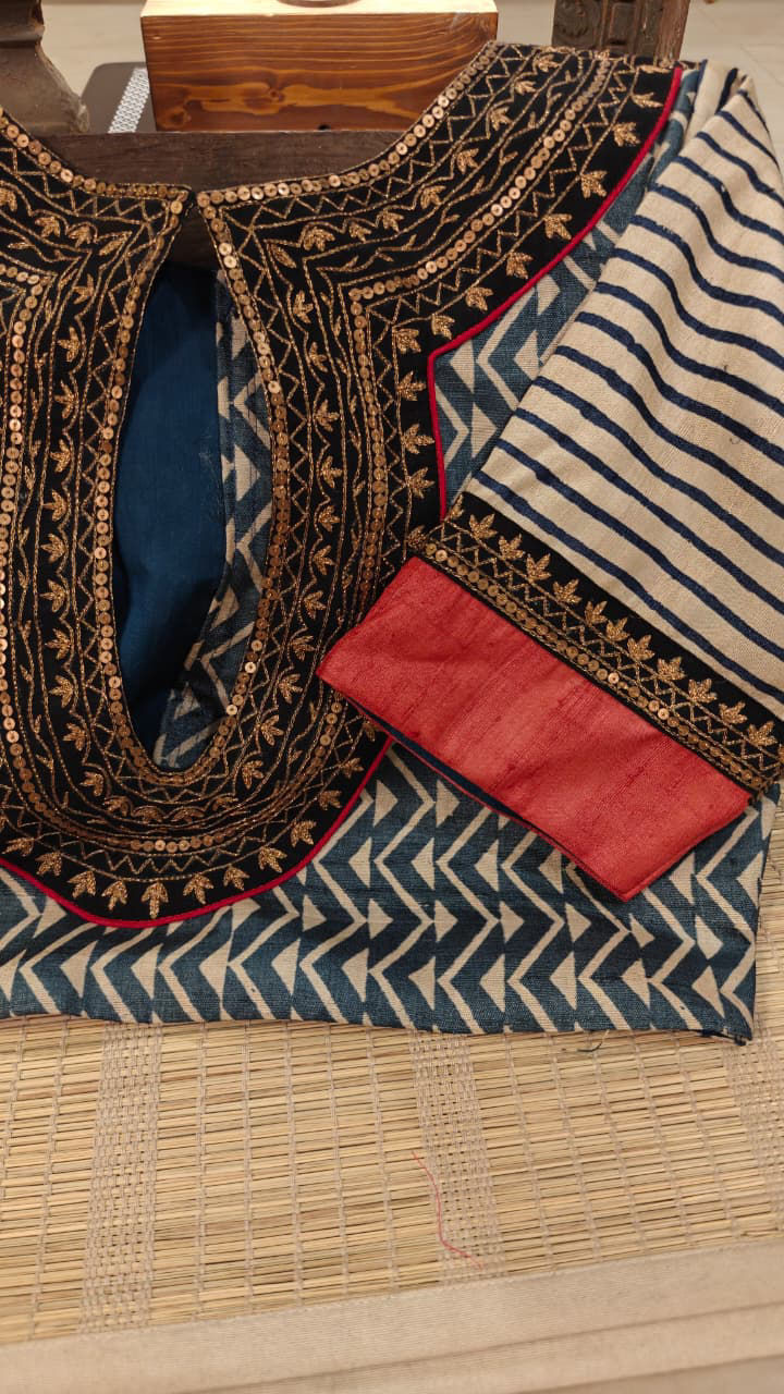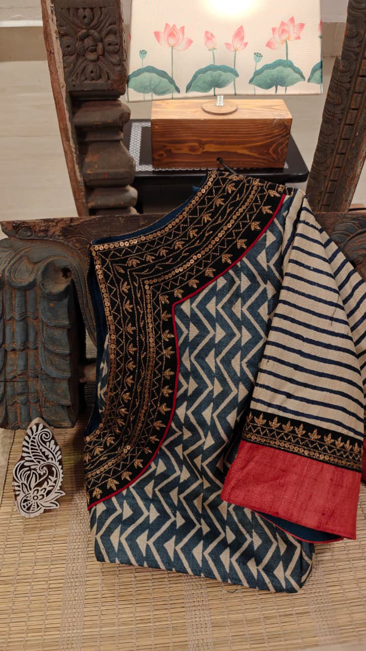 Blue tussar silk hand-blocked in rhythmic geometric patterns, carrying the beauty of time and touch. Sleeves flow in linear lines, finished with a bold red border, while antique gold embroidery traces the neck and sleeves in softly aged tones. A piece that feels archival, thoughtful, and quietly striking — vintage in spirit, timeless in presence.