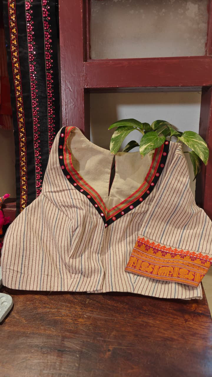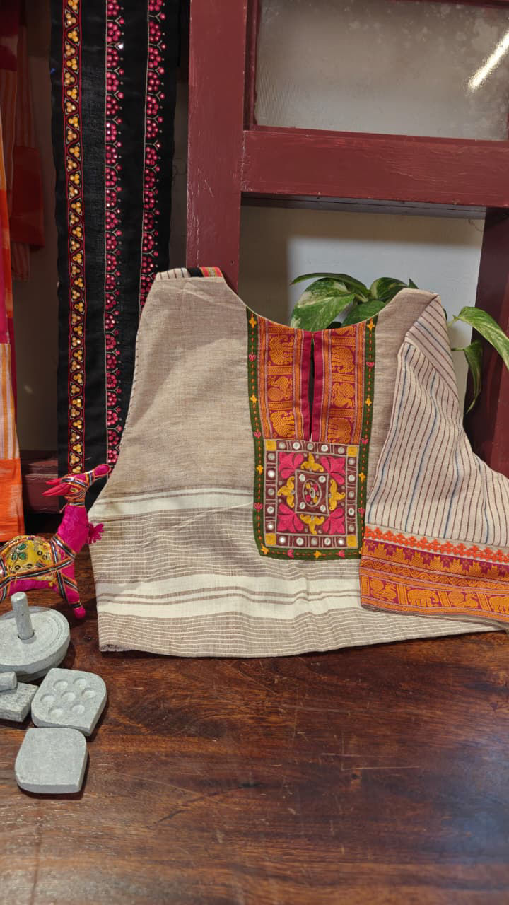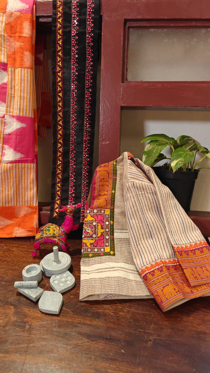Kotpad stripes meet the quiet geometry of Anne Hejje — two rooted weaves coming together in one thoughtful canvas. Raw, rhythmic stripes form the base, while the structured elegance of Anne Hejje adds balance and depth.